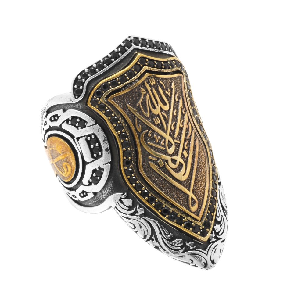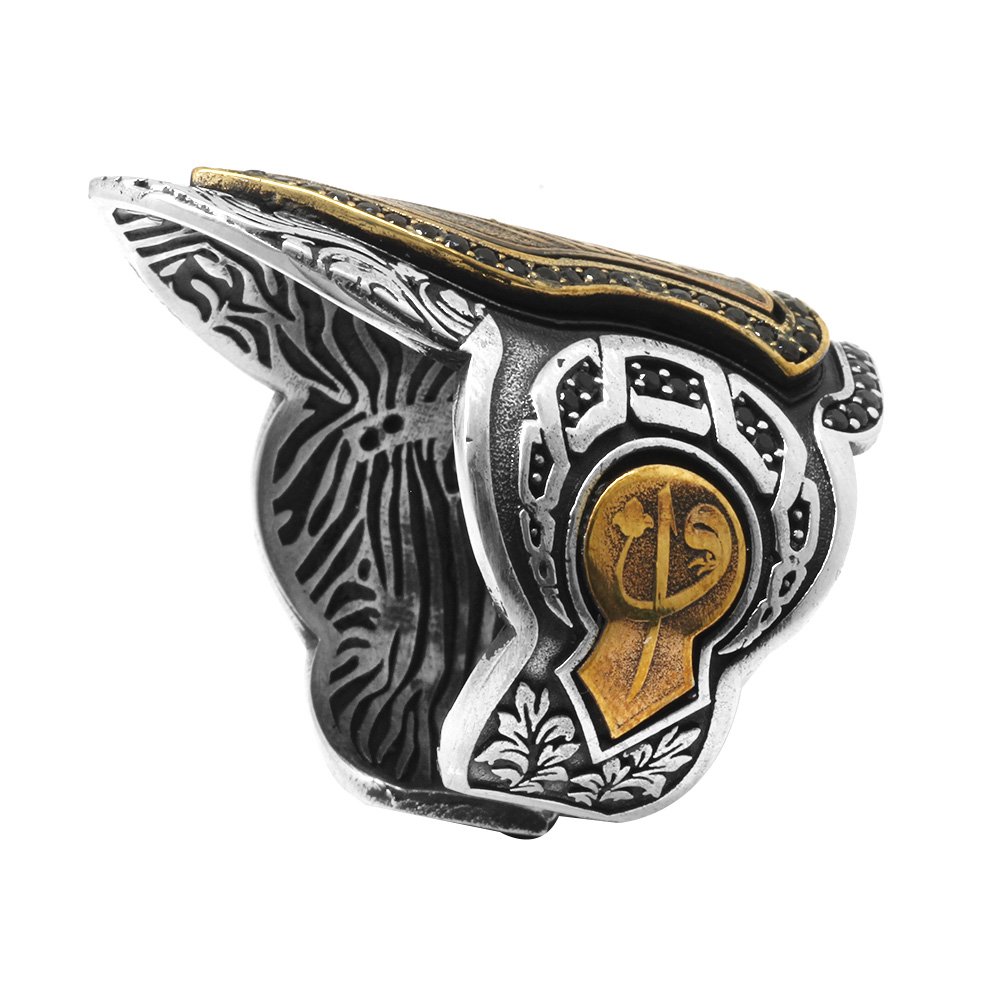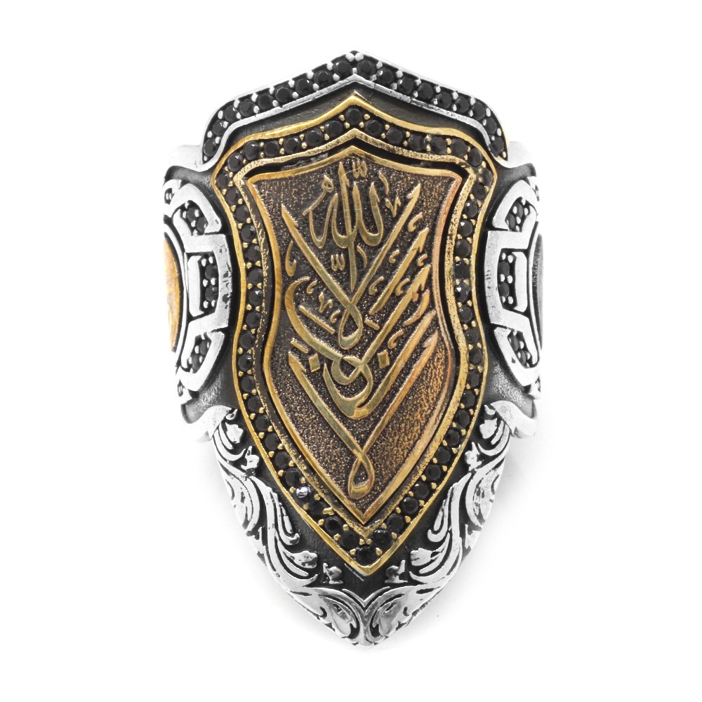 925 Sterling Silber Herren-Bogenschützenring (Zihgir) mit schwarzem Zirkonstein und arabischer „Allah“-Inschrift