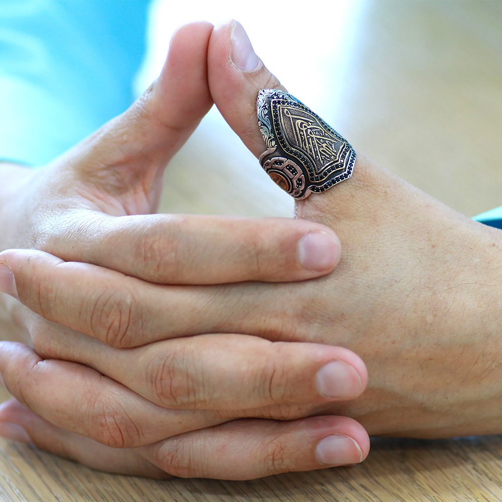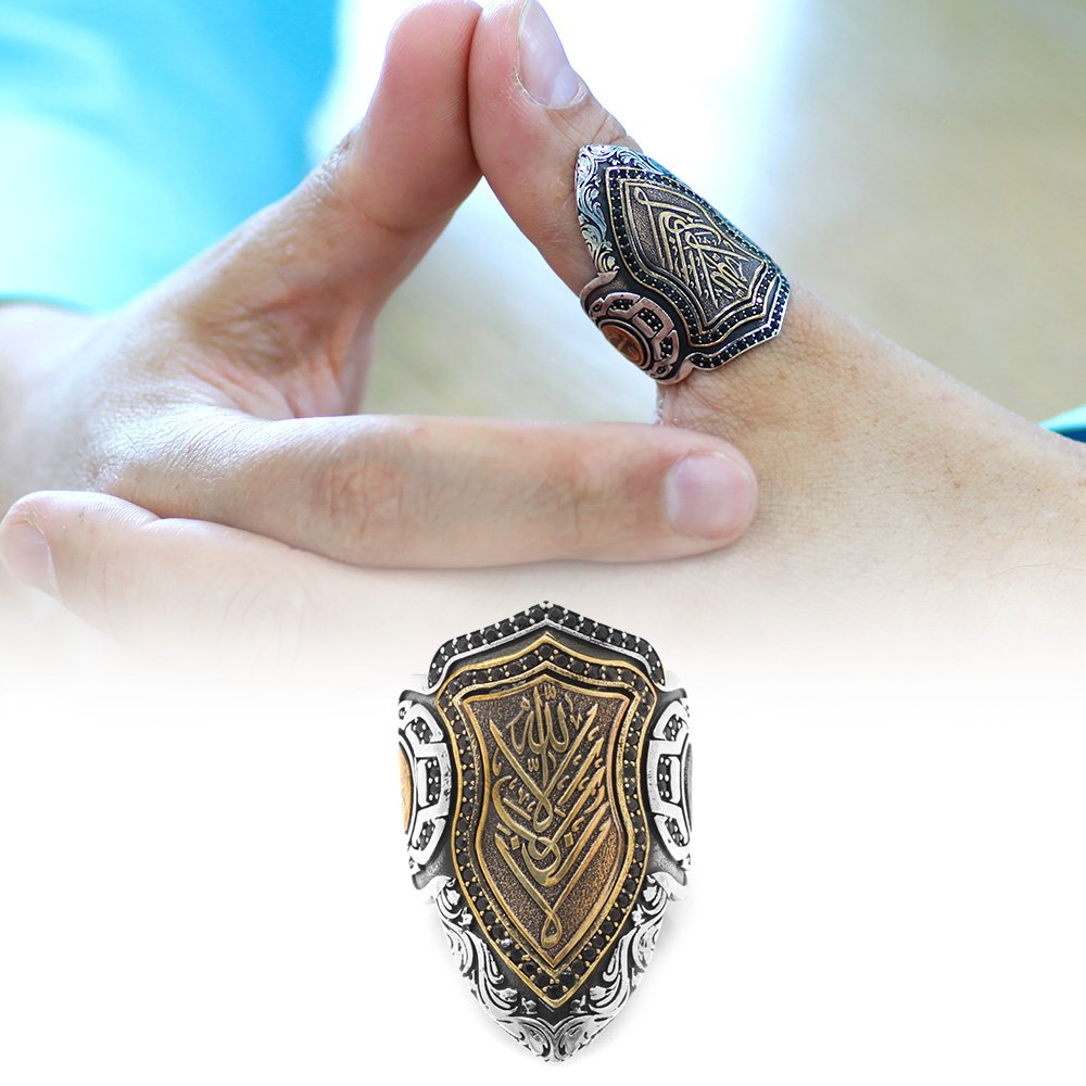 Home d-Ring Herrenringe Ringe ohne Stein 925 Sterling Silber Herren-Bogenschützenring (Zihgir) mit schwarzem Zirkonstein und arabischer „Allah“-Inschrift