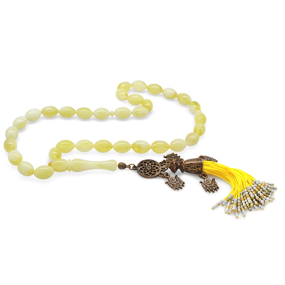 Home TESBİH Bernstein-Gebetsperlen Stangengepresste Bernstein-Gebetsperlen Antiker Kupfer-Rosenkranz aus osmanischem Palast mit Quasten und Gerstenschliff in gelb-weißem Moiré-Moiré-Beirut-Bernstein