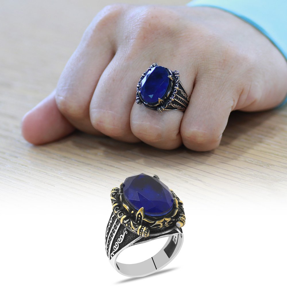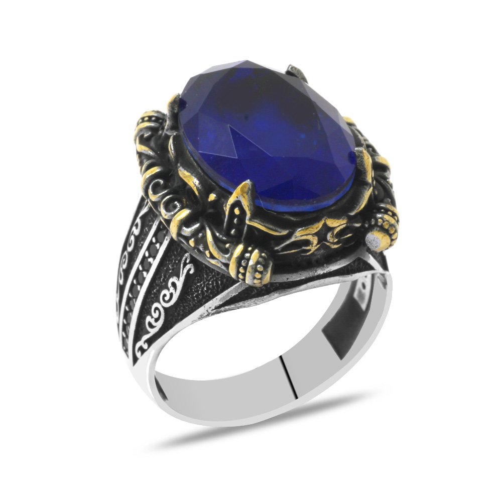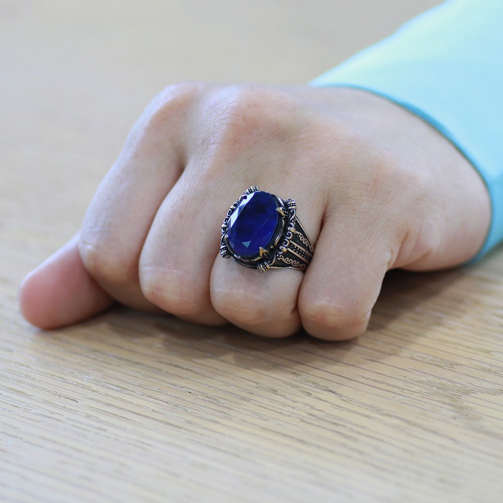 Authentischer Herrenring aus 925er Sterlingsilber mit facettiertem dunkelblauem Zirkonstein