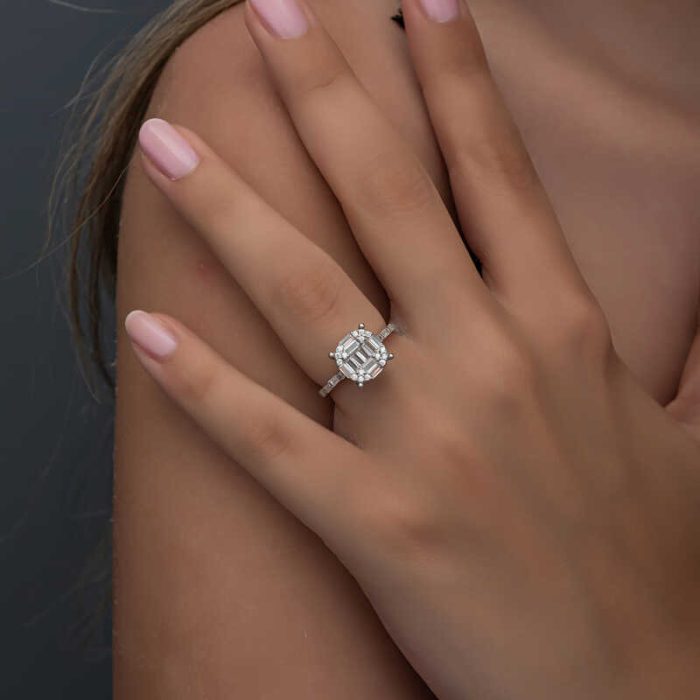 Silberner Damenring mit Baguettesteinen. Dieses stilvolle Ringmodell ist mit funkelnden Baguettesteinen verziert. Es ist eine sehr stilvolle Option, die Sie zu besonderen Anlässen als Geburtstagsgeschenk, Valentinstagsgeschenk oder Geschenk für Mütter wählen können. Der Damenring mit Baguettestein besteht aus 925er Sterlingsilber. Es ist auf Silber rhodiniert. Rhodinierte Silberringe behalten lange ihren Glanz und ihre Oxidation wird verzögert. Die Steine darauf sind Baguette und Zirkon. Wie alle Damenringe aus Silber wird auch das Damenringmodell Silber Baguettestein in Handarbeit gefertigt. Aufgrund von Silber und Edelsteinen kann es zu einer Abweichung von ± 10 % im angegebenen durchschnittlichen Produktgewicht kommen. Breite: 2,00 cm Länge: 2,60 cm Durchschn. Gewicht: 3,30 gr.