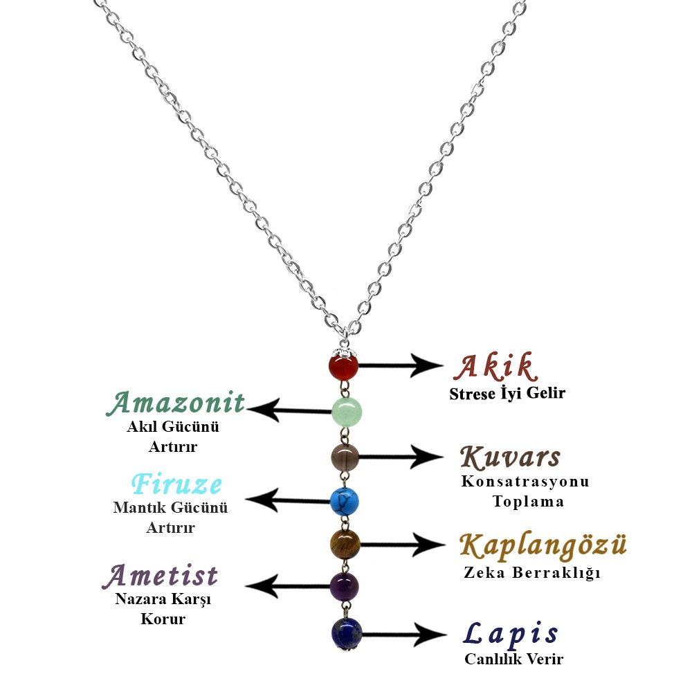 Hergestellt: Naturstein. Verwendete Steine: Achat – Amazonit – Quarz – Türkis – Tigerauge – Amethyst – Lapis. Farbe der Steine: Mischungsgewicht: 7,75 ± gr. Länge: 50 cm Versandverpackung Ihr Produkt wird mit einer Schutzverpackung mit Ihrem Logo geliefert. Spezielle Optionen für Geschenkboxen finden Sie in der Kategorie „Geschenkbox“ im Menü. Beschreibung des Natursteins: Achat: Er verleiht den unter Spannung stehenden Körperbereichen ein Gefühl von Wärme und reduziert Spannungen. Es gibt Energie. Es gibt der Person, die es trägt, Kraft und Freude. Es erhöht die körperliche Vitalität und beseitigt Faulheit. Als Ring verwendet, steigert er das Selbstbewusstsein. Da es lebendig und energisch ist, hilft es Ihnen, die positiven Aspekte von Ereignissen zu erkennen, wenn Sie sich schlecht fühlen. Es schützt Kinder, die den Achatstein in ihren Taschen tragen, vor negativen Emotionen. Amazonit: Erhöht die Fähigkeit zur Selbstdarstellung. Der Amazonitstein, der mit dem Herzen, den Muskeln und dem Nervensystem in Verbindung steht, verleiht dem Leben eines Menschen einen Sinn und erleichtert die Akzeptanz von Veränderungen. Es erhöht die geistige Leistungsfähigkeit und stärkt das Verständnis und die Auffassungsgabe. Quarz: Es kommt in einem sehr weiten Gebiet auf der Erde vor. Es handelt sich um eine Gruppe harter und fester Mineralien. Normalerweise enthält es einen gefrorenen Wassertropfen im Inneren, und wenn es zerbricht, verwandelt es sich wieder in Wasser. Quarz, der seit Jahrhunderten im Bereich der Behandlung eingesetzt wird, wird auch heute noch in diesem Bereich eingesetzt. Es ist ein Stein, der die geistige Konzentration stärkt. Es sammelt Strahlung von Radios, Computern und Mobiltelefonen. Es stimuliert die Gehirnfunktionen. Es zerstört die negative Energie um die Person herum und lädt positive Energie auf. Wenn es auf die Haut aufgetragen und unter der Kleidung getragen wird, schützt es die Person vor den negativen Energien anderer Menschen. Es ist gesund für die Augen. Außerdem hält es das Verdauungs- und Blutkreislaufsystem fit. Firuze: Es ist der Stein der Loyalität, Freundschaft und Kommunikation. Es ist auch ein äußerst wichtiger Stein für die Gesundheit der Knochen. Es lindert Husten und verbessert die geistige und logische Leistungsfähigkeit. Dieser Stein beruhigt Ängste; Es reguliert den Blutdruck und ist gut bei Herzerkrankungen. Es kann auch als Gürtelschnalle, Armband oder Ring bei Verdauungsproblemen verwendet werden. Es kann auch jeden Tag als Schmuck verwendet werden. Besonders in Silber eingebettet verstärkt sich seine Wirkung noch und sorgt für Ausgeglichenheit. Es vermittelt das Gefühl des Friedens, das Menschen brauchen, die über ein Ereignis trauern oder schockiert sind. Türkis ist auch als Stein des Stiers, der Jungfrau, des Skorpions, des Schützen, des Steinbocks und der Fische bekannt. Tigerauge: Es wird auch als Stein der Unabhängigkeit bezeichnet. Der Grund dafür ist, dass angenommen wird, dass der Stein die Menschen, die ihn tragen, unabhängiger von anderen Menschen macht. Es ist nützlich für Kinder, die Albträume haben. Es ermöglicht einem, die gute Seite der Menschen zu sehen. Es ist ein Stein der Stärke und des Mutes. Sie können Ihre Beschwerden lindern, indem Sie die glatte Oberfläche streicheln. Es reduziert Sturheit, ermöglicht eine klarere Sicht und schützt vor dem bösen Blick. Es erinnert Menschen an den eigenen Zweck, die denken, dass ihr Leben keinen Sinn hat. Es kann Ihnen auch ermöglichen, eine telepathische Kommunikation mit den Menschen herzustellen, mit denen Sie in Kontakt stehen. Amethyst: Er wird seit Jahrhunderten in vielen Zivilisationen mit Bewunderung verwendet. Es ist auch der stärkste Stein in Bezug auf die Heilung. Da es eine negative elektrische Ladung trägt, erhöht es die Gehirnleistung, indem es überschüssige Elektrizität im Körper sammelt. Es reicht aus, irgendwo in Ihrer Umgebung zu stehen, um negative Energien zu zerstören und in positive Energie umzuwandeln. Es ist gut gegen Schlaflosigkeit. Da es sich um einen Stein handelt, den Sie immer bei sich tragen können, versorgt er Sie stets mit Nutzen und Energie. Es gibt Energie. Lapis: Auch Nachtstein genannt. Es hat ein durchscheinendes oder undurchsichtiges Aussehen. Es ist ein Stein, der durch die Verbindung von Kalkstein und Mineralien entsteht. Afghanistan, Pakistan, Italien, Angola und Sibirien sind die Hauptabbaugebiete. Lapis stärkt die Knochen. Es schützt Kinder vor Atemwegserkrankungen und lenkt sie von ihren Ängsten ab. Es aktiviert auch die Schilddrüse. Es reguliert den Blutdruck, stärkt die körperlichen Fähigkeiten und Kommunikationsfähigkeiten. Es klärt Gedanken und verleiht Ihren Gedanken Intensität. Die von ihm abgegebene Energie kann bei empfindlichen Menschen Schwindelgefühle hervorrufen. Es reduziert Ängste und verleiht Vitalität. Daher sollte es mit Vorsicht verwendet werden.