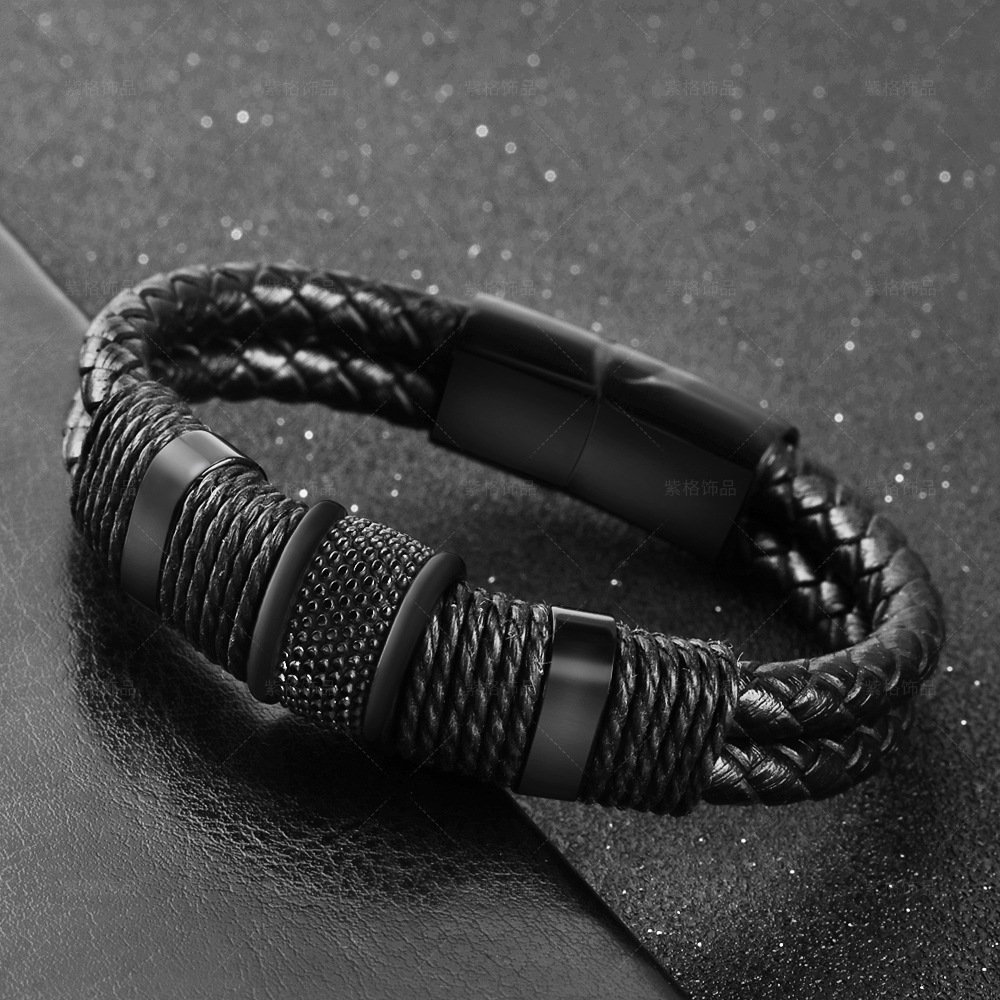 Home Herren Armband Erstklassiges doppellagiges schwarzes Leder & Seil & schwarze Farbe 316L-Qualitätsstahl-Kombination/Mechanismus Avantgardistisches Herrenarmband