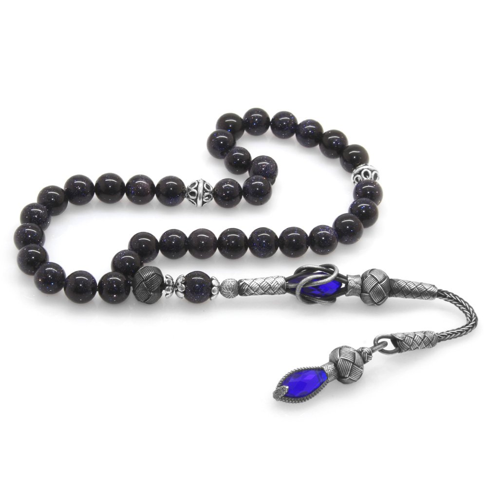 Gebetsperlen aus 1000er-Sterlingsilber, Kazaz, mit Quasten, Kugelschliff, blauer Sternstein, Naturstein