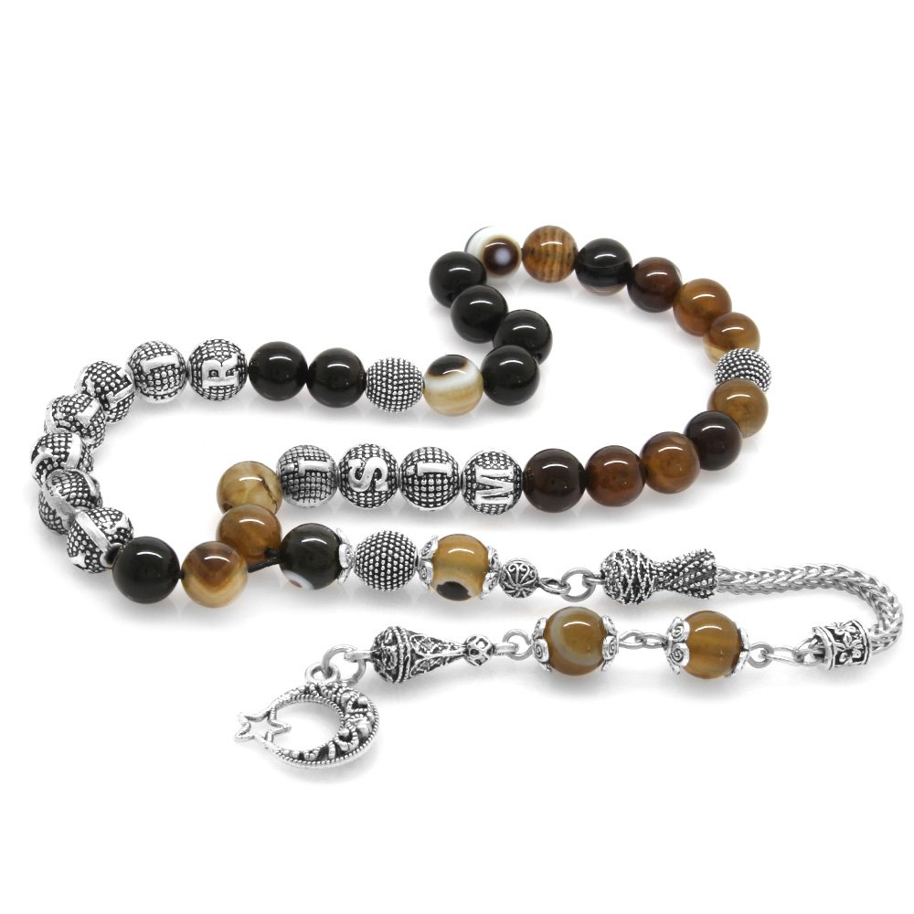 Gebetsperlen aus Madagaskar-Achat-Naturstein mit anlauffreien Metallquasten und Namensaufschrift im Kugelschliff