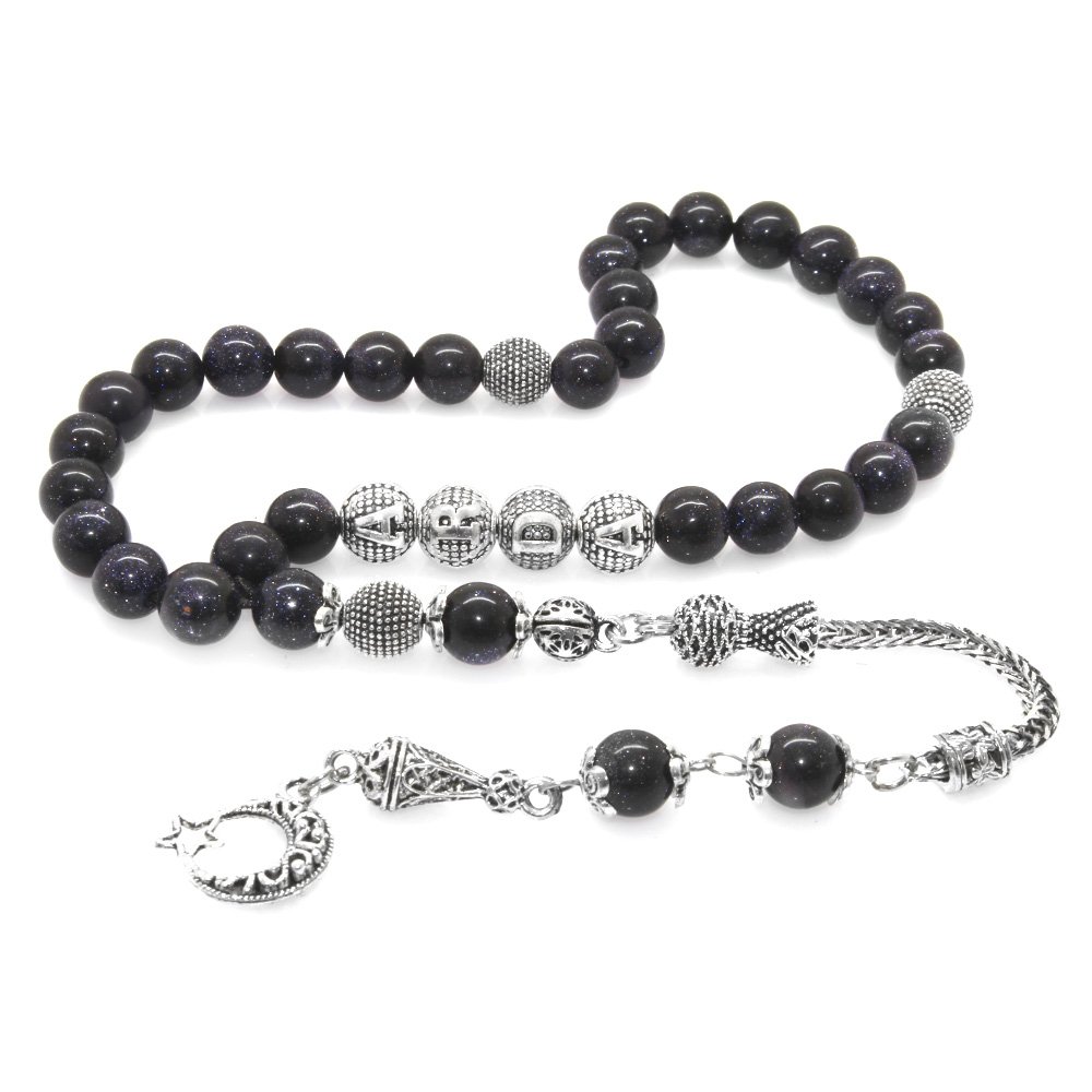 Gebetsperlen aus Naturstein mit blauem Sternstein im Kugelschliff, mit anlauffreien Metallquasten und personalisierter Namensschrift