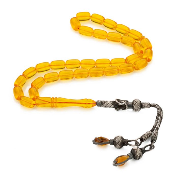 Home Zubehör Gebetsperlen Gebetsperlen aus Bernstein Gepresster Bernstein Gelbe Gebetsperlen aus gepresstem Bernstein mit Steinen und doppeltem Silbergehäuse