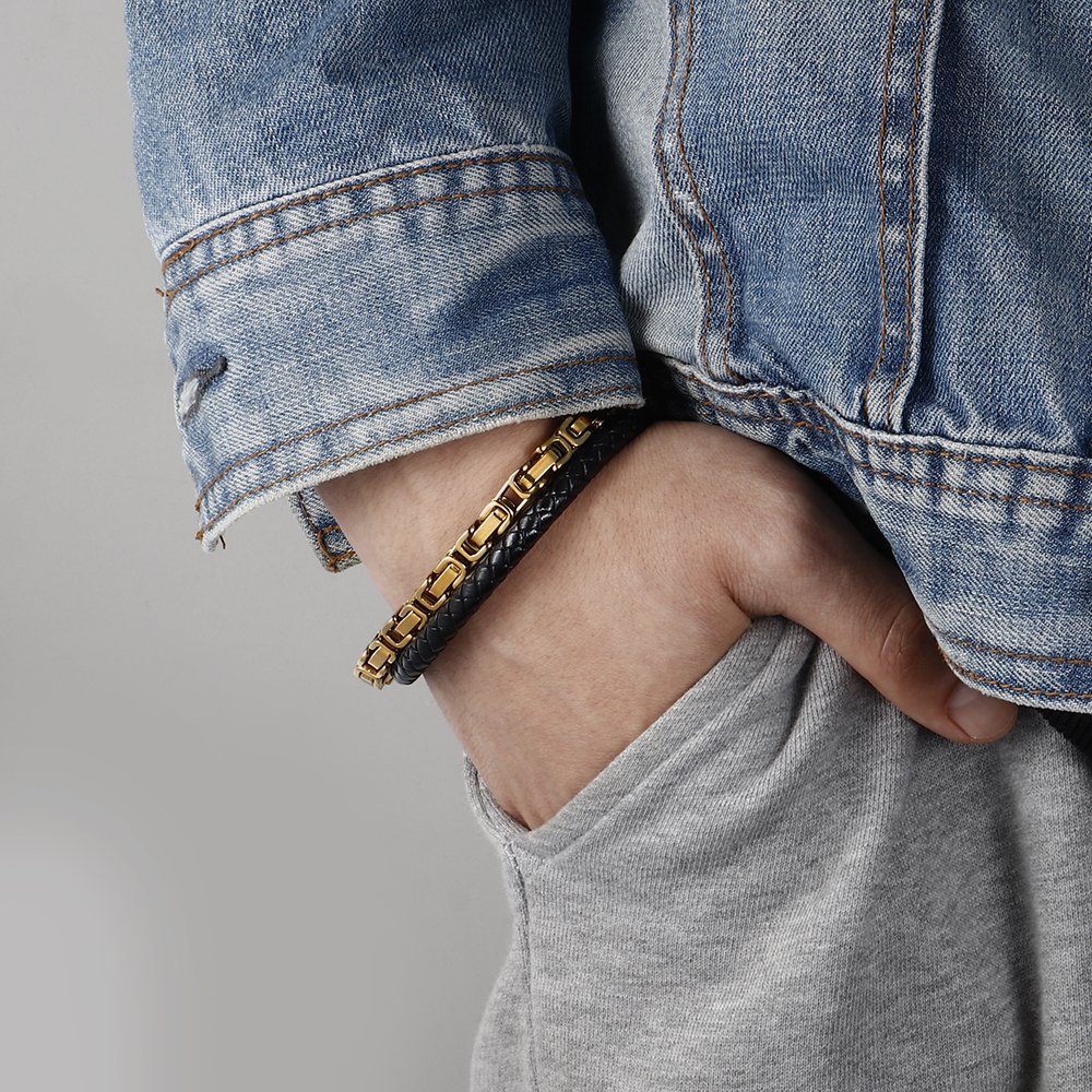 Home Herren Armband Goldfarbene Königskette und geflochtenes Echtleder-Kombinations-Magnetschnalle-Mechanismus aus 316L-Qualitätsstahl für Herren