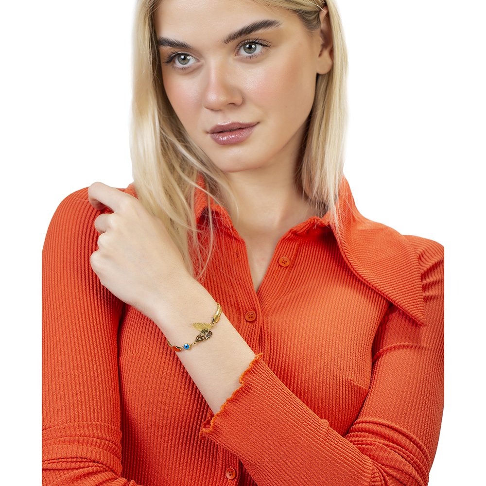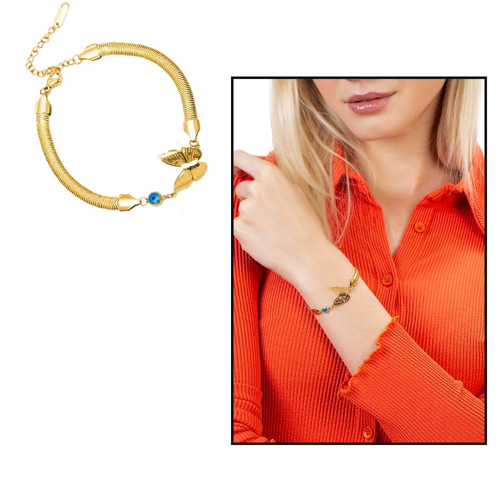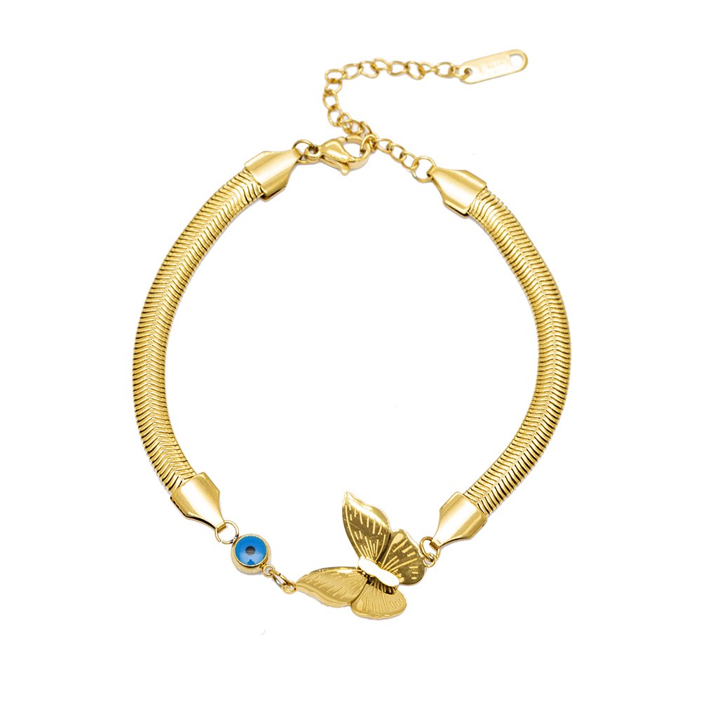 Home BİLEKLİK Kadın Bileklikleri Çelik Kadın Bileklikler Goldfarbenes, anlauffreies Metall-Schlangenketten-Schmetterlings-Design-Damenarmband mit Evil-Eye-Perlendetail