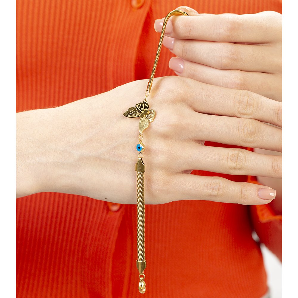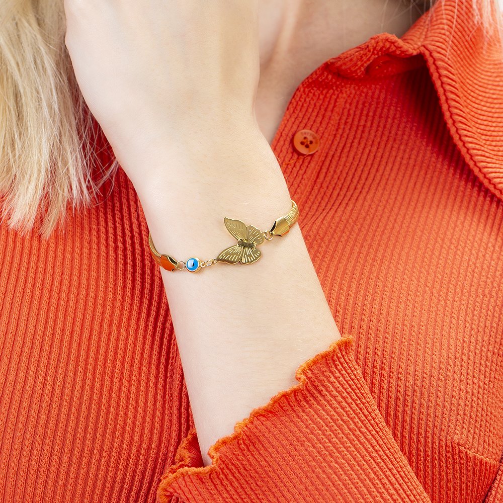 Goldfarbenes, anlauffreies Metall-Schlangenketten-Schmetterlings-Design-Damenarmband mit Evil-Eye-Perlendetail