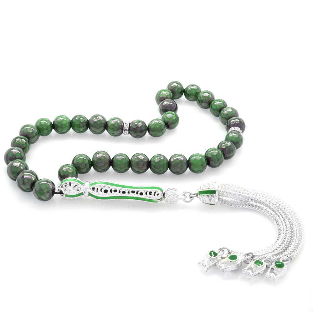 Grün emaillierte Globe Cut His Stone-Gebetsperlen mit Alpaka-Quasten