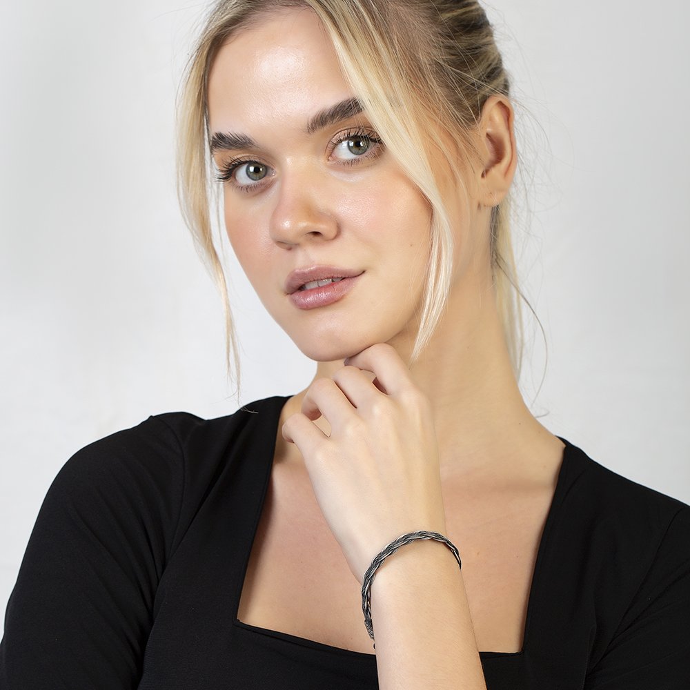 Silberfarbenes, anlaufgeschütztes Damenarmband mit Schlangenkette und geflochtenem Design aus Metall