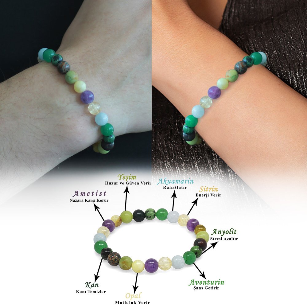 Hergestellt aus: Naturstein. Verwendete Steine: Amethyst-Anyolit-Aquamarin-Aventurin-Blut-Citrin-Opal-Jade. Farbe: Mischung. Länge: Gummi. Vorbereitungszeit: 1 Werktag. Produktverpackung. Ihr Produkt wird mit einer Schutzverpackung mit Ihrem Logo versendet. Spezielle Optionen für Geschenkboxen finden Sie in der Kategorie „Geschenkbox“ im Menü. Beschreibung des Natursteins Amethyst: Er wird seit Jahrhunderten in vielen Zivilisationen mit Bewunderung verwendet. Es ist auch der stärkste Stein in Bezug auf die Heilung. Da es eine negative elektrische Ladung trägt, erhöht es die Gehirnleistung, indem es überschüssige Elektrizität im Körper sammelt. Es reicht aus, irgendwo in Ihrer Umgebung zu stehen, um negative Energien zu zerstören und in positive Energie umzuwandeln. Es ist gut gegen Schlaflosigkeit. Da es sich um einen Stein handelt, den Sie immer bei sich tragen können, versorgt er Sie stets mit Nutzen und Energie. Es gibt Energie. Anyolith: Es reguliert den Körper, stärkt ihn und gibt Energie. Es lindert Faulheit und Lethargie des Menschen und wirkt gegen chronische Müdigkeit. Beruhigt, reduziert Stress und Reizbarkeit. Es aktiviert und stärkt die Nebennieren und Lymphknoten. Es gleicht die Blutgerinnung aus. Es reinigt und erneuert das Blut. Es ist gut bei Augenkrankheiten und stärkt die Augen. Aquamarin: Es ist einer der wertvollsten Steine. Die wichtigsten Merkmale, die seinen Wert steigern, sind der Grad der Transparenz, die Dunkelheit seiner Farbe und die Sauberkeit des Innenraums. Es steigert Ihr Selbstvertrauen. Es ist gut bei Halsschmerzen, Bronchitis, Atemwegserkrankungen und Schilddrüsenerkrankungen. Es ist wirksam bei der Behandlung psychischer Erkrankungen. Es stärkt die Intuition. Der Aquamarinstein, auch Stein des Überflusses und des Glücks genannt, ist auch der Feind von Stress und Anspannung. Wenn Sie eine extrem wütende, angespannte und gereizte Person sind, wird es Ihnen helfen, in einen friedvolleren Zustand zu gelangen. Aventurin: Dieser Stein, der metallisches Funkeln ausstrahlt, hat eine körnige Struktur. Er ist als Stein des Glücks bekannt. Es wirkt emotional ausgleichend und wirkt auch gegen Depressionen. Sie können es nutzen, um sich glücklich zu fühlen. Es ist besonders vorteilhaft für die Herzgesundheit. Wenn es in der Nähe des Herzens platziert wird, schützt es Sie vor der Negativität anderer Menschen. Es ermöglicht Ihnen, offenherzig zu sein. Er ist auch als Stein der Träumer bekannt. Es ist gut für Menschen, die sich in Denkmustern befinden, die sie einschränken oder behindern. Es ist auch der am besten geeignete Stein für junge Leute, die ihr eigenes Ding machen. Blut: Blutstein ist ein ausgezeichneter Blutreiniger und ein kraftvoller Heilstein. Es verbessert die Intuition und steigert die Kreativität. Es hilft, Auswirkungen wie geopathischen oder elektromagnetischen Stress zu überwinden, indem es negative Umweltenergie anzieht. Es regt zum Träumen an und ist ein starkes Stärkungsmittel. Es macht Mut und lehrt Sie, gefährliche Situationen zu vermeiden. Es beruhigt und belebt den Geist, lindert Verwirrung, insbesondere aufgrund von Stress, und verbessert die Entscheidungsfindung. Hilft bei der Anpassung an ungewöhnliche Bedingungen. Es reduziert Reizbarkeit, Aggression und Ungeduld. Citrin: Seine Farbe erhält es durch das darin enthaltene seltene Eisen. Er wird auch als Kaufmannsstein bezeichnet. Der Grund dafür ist, dass Menschen, die in der Vergangenheit Handel trieben, diesen Stein in ihren Tresoren aufbewahrten und glaubten, er sei fruchtbar. Es wird angenommen, dass Citrinstein Erfolg bringt. Es wird verwendet, um unerwünschte Energien in der Umgebung zu blockieren. Es erhöht die geistige Klarheit und das Selbstvertrauen. Es gibt Selbstvertrauen in Situationen von Selbstzweifeln, Zweifeln und Nervosität. Es schenkt der Person, die es trägt, Gefühle der Freude und des Glücks. Es beseitigt Akne und schützt vor Hautkrankheiten. Es hilft, Süchte loszuwerden. Es schafft auch Einheit und Solidarität unter den Familienmitgliedern. Opal: Es wird angenommen, dass der Opalstein seinem Besitzer großes Glück bringt. Es ist bekannt, dass Menschen, die diesen Stein tragen, sich im täglichen Leben glücklicher fühlen. Opalstein hat eine frische und schöne Energie. Bei dieser Energie geht es nicht nur um die Visualität des Steins. Es ist bekannt, dass Menschen, die diesen Stein tragen, sich motiviert und glücklich fühlen. Viele Experten empfehlen diesen Stein, um Menschen vor Stress zu schützen. Es sollte auch gesagt werden, dass Menschen, die Opalsteine ​​tragen oder in ihren Häusern aufbewahren, dem Stress des Alltags fernbleiben. Jade: Es hat eine friedliche und beruhigende Wirkung, die es Ihnen ermöglicht, Ihre Sorgen loszuwerden. Es bringt Klarheit in die Gedanken und stärkt die geistige Aktivität. Es fördert das emotionale Gleichgewicht und hat eine schützende Wirkung gegen Extreme. Es ist ein Antioxidans. Seine positive Wirkung wurde bei der Entfernung von Giftstoffen und der Reinigung des Blutes beobachtet. Es erleichtert die Konzentration.