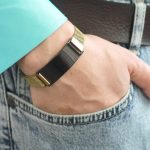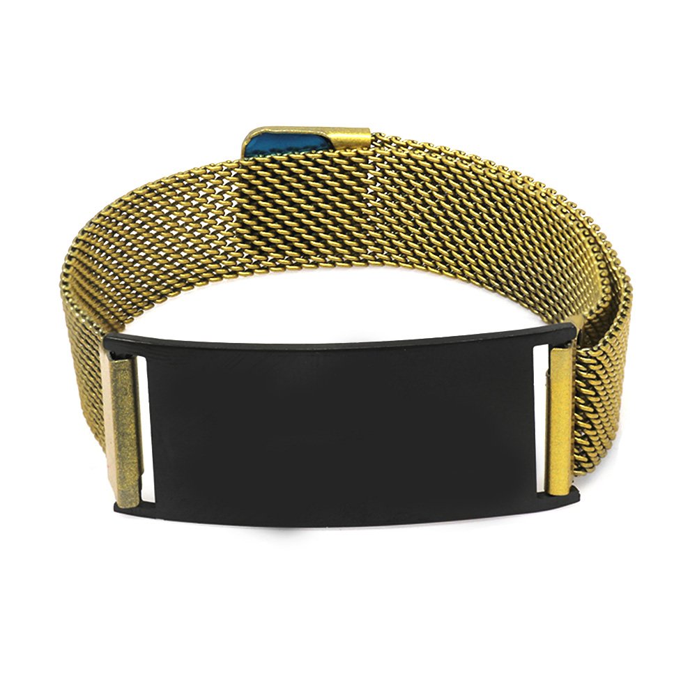 Herren-Mesh-Armband aus antikgelbem Stahl mit schwarzem Hintergrund und personalisiertem Magnetverschluss mit Namensaufschrift