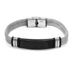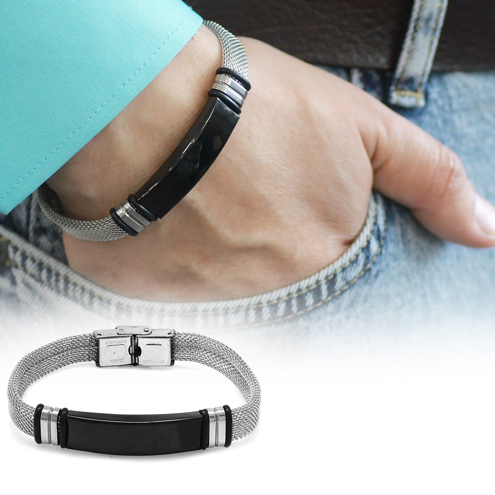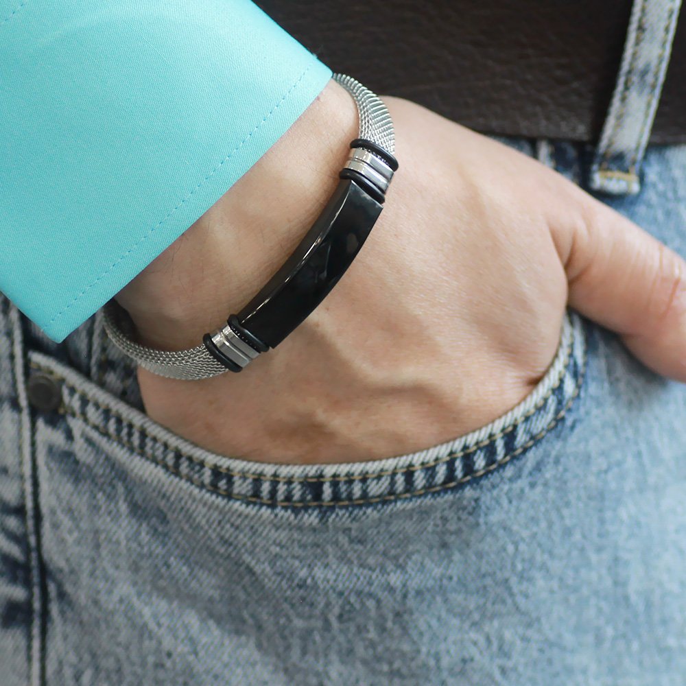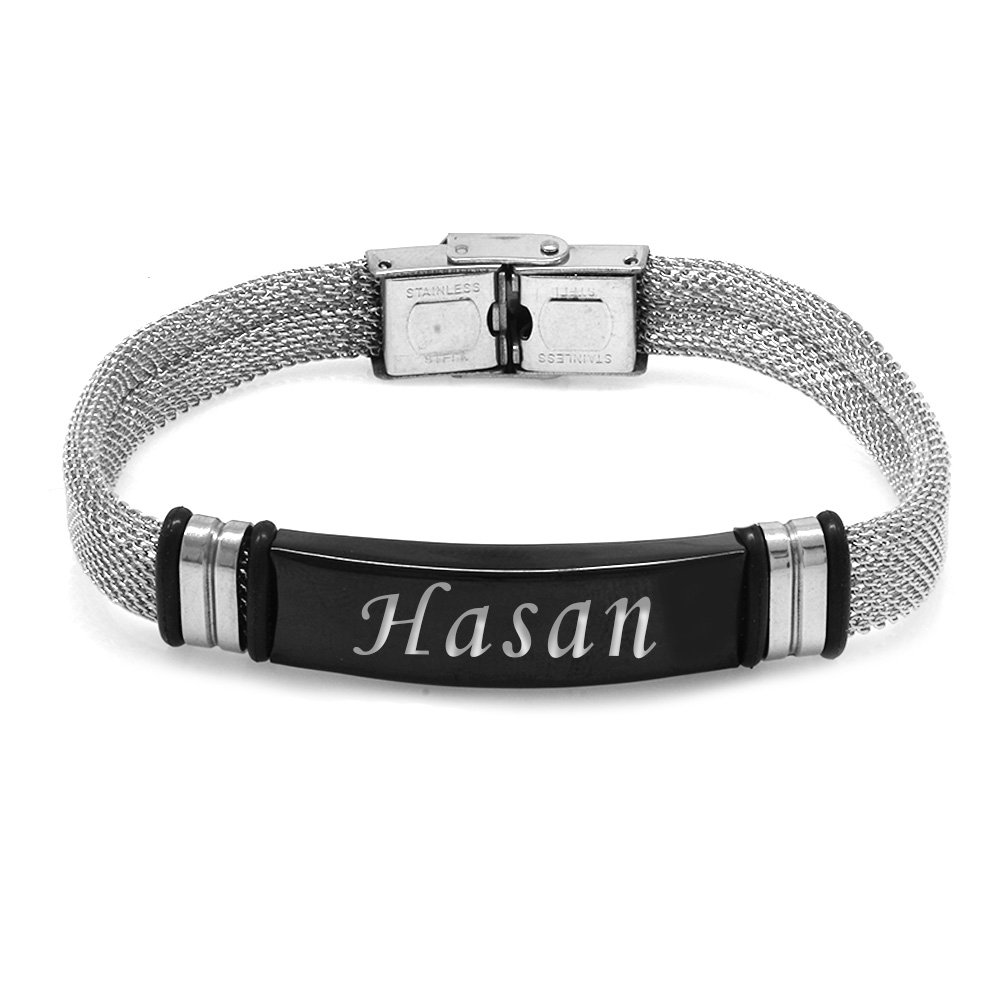 Herren-Mesh-Armband aus silberfarbenem Stahl mit personalisiertem Namen auf schwarzem Hintergrund