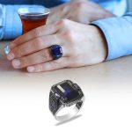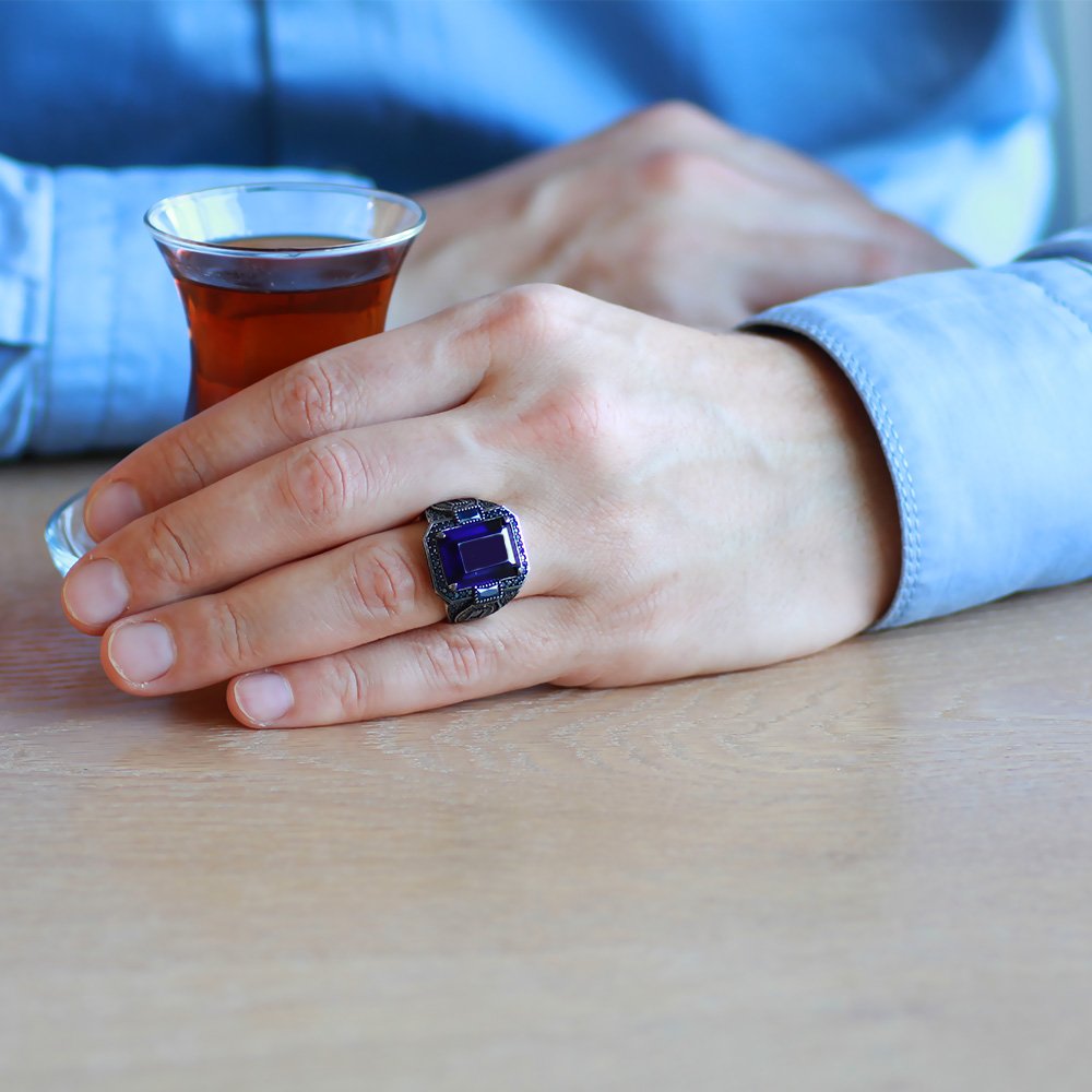 Tuğra Herrenring aus 925er Sterlingsilber mit besticktem quadratischem Onyxstein
