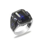 Herrenring aus 925er-Sterlingsilber mit dunkelblauem Zirkonstein im Baguetteschliff und Mikrosteinbesatz an den Seiten