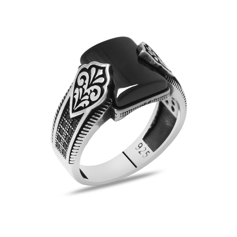 Herrenring aus 925er-Sterlingsilber mit gesticktem Zirkonstein und gewölbtem Onyxstein im Grunddesign