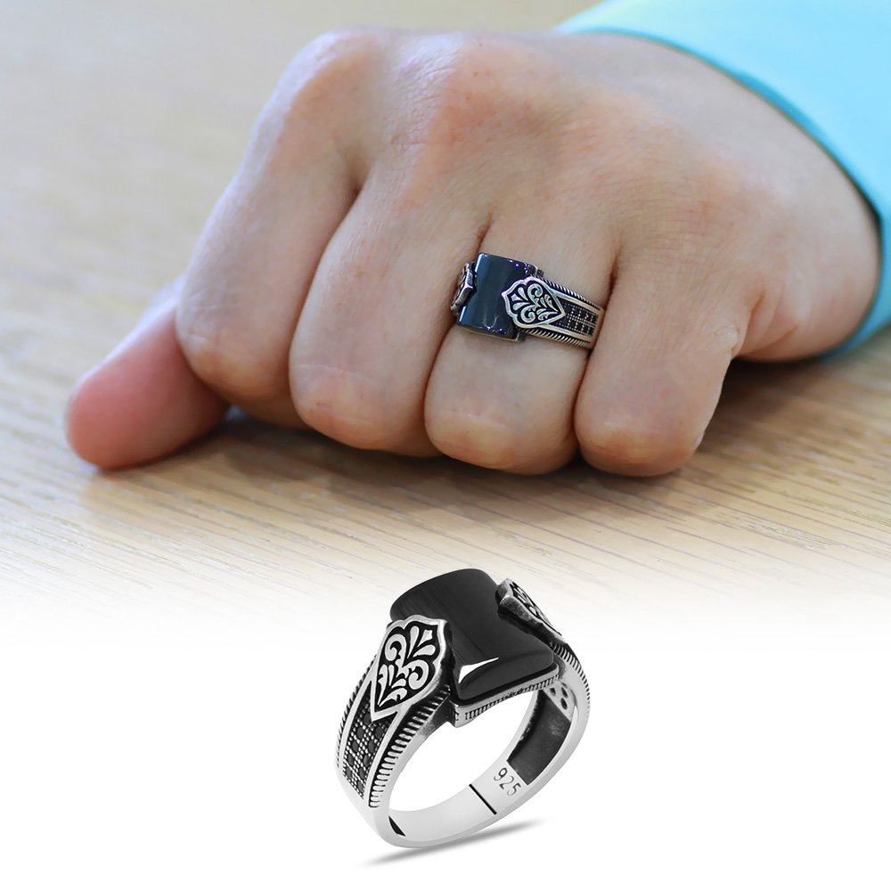 Herrenring aus 925er Sterlingsilber mit gepunktetem, gesticktem Monogrammmotiv und schwarzem Onyxstein