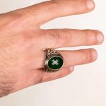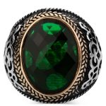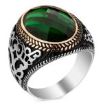 Herrenring aus 925er Sterlingsilber mit grünem Zirkonstein. Eigenschaften: Hergestellt aus 925er Sterlingsilber. Es wiegt etwa 16 Gramm. Es wurde Zirkonstein verwendet. An den Seiten des Rings befinden sich symmetrische Motive.