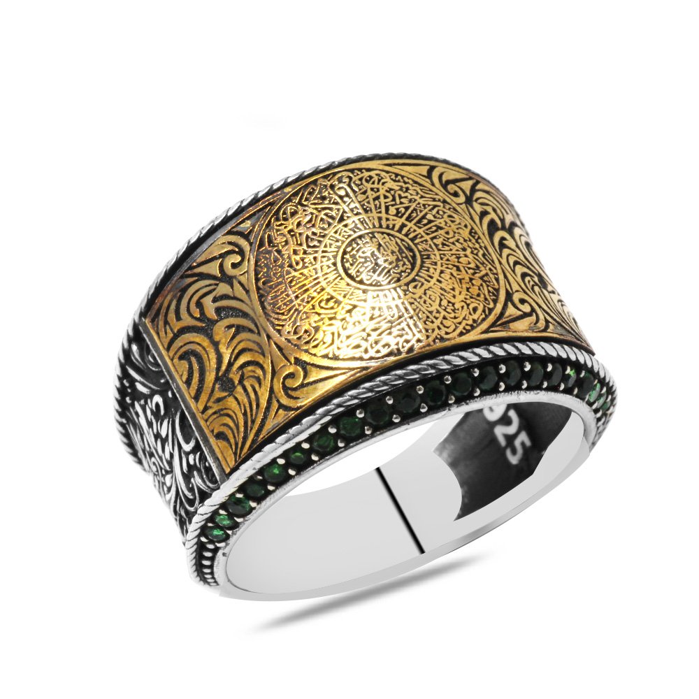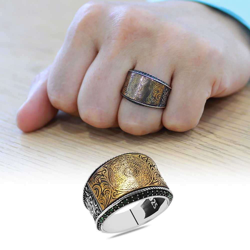 Herrenring aus 925er Sterlingsilber mit grünem Zirkonstein und der Aufschrift „Surah Al-Inshirah“.