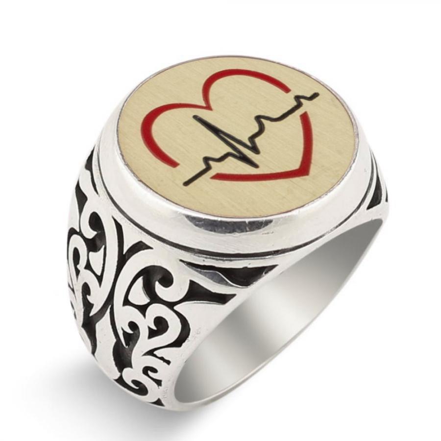 Eigenschaften des Herz-Rhythmus-gemusterten Silberrings: Hergestellt aus 925er Sterlingsilber. Es wiegt etwa 21 Gramm. Der Ring ist mit cremefarbener Emaille versehen.
