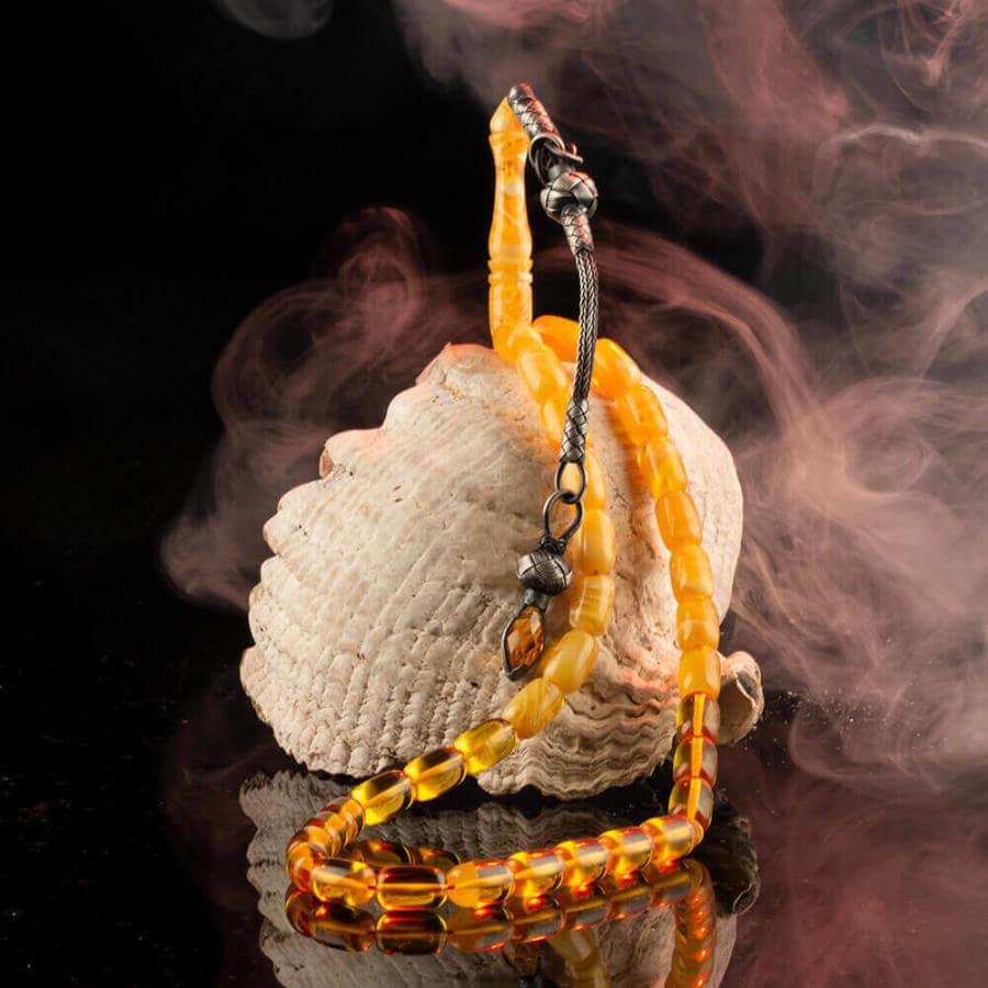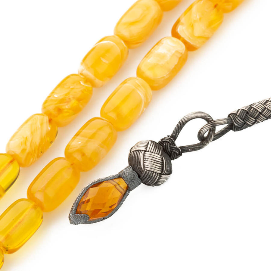 Home Zubehör Gebetsperlen Gebetsperlen aus Bernstein Gepresster Bernstein Kazazlı Gebetsperlen aus gepresstem Bernstein, Moiré-Gelbtöne