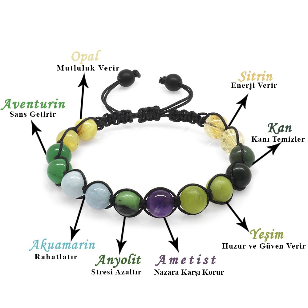 Hergestellt: Naturstein. Verwendete Steine: Amethyst-Anyolit-Aquamarin-Aventurin-Blut-Citrin-Opal-Jade. Farbe: Mischung. Gewicht: 11,65 g. Länge: Geschlossen: 15,5 cm / Offen: 23 cm Vorbereitungszeit: 1 Werktag Produktverpackung Ihr Produkt wird in einer Schutzverpackung mit Logo versendet. Spezielle Optionen für Geschenkboxen finden Sie in der Kategorie „Geschenkbox“ im Menü. Beschreibung des Natursteins Amethyst: Er wird seit Jahrhunderten in vielen Zivilisationen mit Bewunderung verwendet. Es ist auch der stärkste Stein in Bezug auf die Heilung. Da es eine negative elektrische Ladung trägt, erhöht es die Gehirnleistung, indem es überschüssige Elektrizität im Körper sammelt. Es reicht aus, irgendwo in Ihrer Umgebung zu stehen, um negative Energien zu zerstören und in positive Energie umzuwandeln. Es ist gut gegen Schlaflosigkeit. Da es sich um einen Stein handelt, den Sie immer bei sich tragen können, versorgt er Sie stets mit Nutzen und Energie. Es gibt Energie. Anyolith: Es reguliert den Körper, stärkt ihn und gibt Energie. Es lindert Faulheit und Lethargie des Menschen und wirkt gegen chronische Müdigkeit. Beruhigt, reduziert Stress und Reizbarkeit. Es aktiviert und stärkt die Nebennieren und Lymphknoten. Es gleicht die Blutgerinnung aus. Es reinigt und erneuert das Blut. Es ist gut bei Augenkrankheiten und stärkt die Augen. Aquamarin: Es ist einer der wertvollsten Steine. Die wichtigsten Merkmale, die seinen Wert steigern, sind der Grad der Transparenz, die Dunkelheit seiner Farbe und die Sauberkeit des Innenraums. Es steigert Ihr Selbstvertrauen. Es ist gut bei Halsschmerzen, Bronchitis, Atemwegserkrankungen und Schilddrüsenerkrankungen. Es ist wirksam bei der Behandlung psychischer Erkrankungen. Es stärkt die Intuition. Der Aquamarinstein, auch Stein des Überflusses und des Glücks genannt, ist auch der Feind von Stress und Anspannung. Wenn Sie eine extrem wütende, angespannte und gereizte Person sind, wird es Ihnen helfen, in einen friedvolleren Zustand zu gelangen. Aventurin: Dieser Stein, der metallisches Funkeln ausstrahlt, hat eine körnige Struktur. Er ist als Stein des Glücks bekannt. Es wirkt emotional ausgleichend und wirkt auch gegen Depressionen. Sie können es nutzen, um sich glücklich zu fühlen. Es ist besonders vorteilhaft für die Herzgesundheit. Wenn es in der Nähe des Herzens platziert wird, schützt es Sie vor der Negativität anderer Menschen. Es ermöglicht Ihnen, offenherzig zu sein. Er ist auch als Stein der Träumer bekannt. Es ist gut für Menschen, die sich in Denkmustern befinden, die sie einschränken oder behindern. Es ist auch der am besten geeignete Stein für junge Leute, die ihr eigenes Ding machen. Blut: Blutstein ist ein ausgezeichneter Blutreiniger und ein kraftvoller Heilstein. Es verbessert die Intuition und steigert die Kreativität. Es hilft, Auswirkungen wie geopathischen oder elektromagnetischen Stress zu überwinden, indem es negative Umweltenergie anzieht. Es regt zum Träumen an und ist ein starkes Stärkungsmittel. Es macht Mut und lehrt Sie, gefährliche Situationen zu vermeiden. Es beruhigt und belebt den Geist, lindert Verwirrung, insbesondere aufgrund von Stress, und verbessert die Entscheidungsfindung. Hilft bei der Anpassung an ungewöhnliche Bedingungen. Es reduziert Reizbarkeit, Aggression und Ungeduld. Citrin: Seine Farbe erhält es durch das darin enthaltene seltene Eisen. Er wird auch als Kaufmannsstein bezeichnet. Der Grund dafür ist, dass Menschen, die in der Vergangenheit Handel trieben, diesen Stein in ihren Tresoren aufbewahrten und glaubten, er sei fruchtbar. Es wird angenommen, dass Citrinstein Erfolg bringt. Es wird verwendet, um unerwünschte Energien in der Umgebung zu blockieren. Es erhöht die geistige Klarheit und das Selbstvertrauen. Es gibt Selbstvertrauen in Situationen von Selbstzweifeln, Zweifeln und Nervosität. Es schenkt der Person, die es trägt, Gefühle der Freude und des Glücks. Es beseitigt Akne und schützt vor Hautkrankheiten. Es hilft, Süchte loszuwerden. Es schafft auch Einheit und Solidarität unter den Familienmitgliedern. Opal: Es wird angenommen, dass der Opalstein seinem Besitzer großes Glück bringt. Es ist bekannt, dass Menschen, die diesen Stein tragen, sich im täglichen Leben glücklicher fühlen. Opalstein hat eine frische und schöne Energie. Bei dieser Energie geht es nicht nur um die Visualität des Steins. Es ist bekannt, dass Menschen, die diesen Stein tragen, sich motiviert und glücklich fühlen. Viele Experten empfehlen diesen Stein, um Menschen vor Stress zu schützen. Es sollte auch gesagt werden, dass Menschen, die Opalsteine ​​tragen oder in ihren Häusern aufbewahren, dem Stress des Alltags fernbleiben. Jade: Es hat eine friedliche und beruhigende Wirkung, die es Ihnen ermöglicht, Ihre Sorgen loszuwerden. Es bringt Klarheit in die Gedanken und stärkt die geistige Aktivität. Es fördert das emotionale Gleichgewicht und hat eine schützende Wirkung gegen Extreme. Es ist ein Antioxidans. Seine positive Wirkung wurde bei der Entfernung von Giftstoffen und der Reinigung des Blutes beobachtet. Es erleichtert die Konzentration.