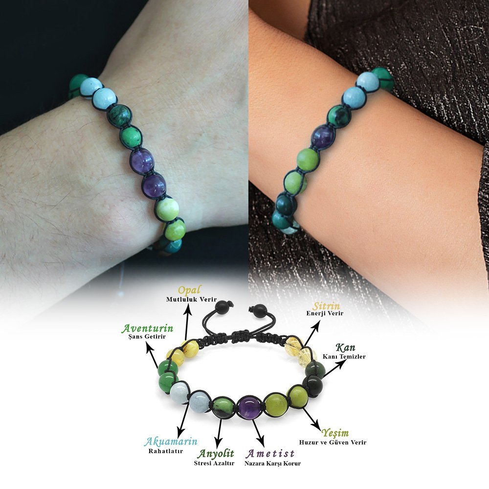 Hergestellt aus:NatursteinVerwendete Steine:Amethyst-Anyolit-Aquamarin-Aventurin-Blut-Citrin-Opal-JadeFarbe:MischungLänge:MakrameeVorbereitungszeit:1 Werktag ProduktverpackungIhr Produkt wird mit einer Schutzverpackung mit Ihrem Logo versendet. Spezielle Optionen für Geschenkboxen finden Sie in der Kategorie „Geschenkbox“ im Menü. Beschreibung des Natursteins Amethyst: Er wird seit Jahrhunderten in vielen Zivilisationen mit Bewunderung verwendet. Es ist auch der stärkste Stein in Bezug auf die Heilung. Da es eine negative elektrische Ladung trägt, erhöht es die Gehirnleistung, indem es überschüssige Elektrizität im Körper sammelt. Es reicht aus, irgendwo in Ihrer Umgebung zu stehen, um negative Energien zu zerstören und in positive Energie umzuwandeln. Es ist gut gegen Schlaflosigkeit. Da es sich um einen Stein handelt, den Sie immer bei sich tragen können, versorgt er Sie stets mit Nutzen und Energie. Es gibt Energie. Anyolith: Es reguliert den Körper, stärkt ihn und gibt Energie. Es lindert Faulheit und Lethargie des Menschen und wirkt gegen chronische Müdigkeit. Beruhigt, reduziert Stress und Reizbarkeit. Es aktiviert und stärkt die Nebennieren und Lymphknoten. Es gleicht die Blutgerinnung aus. Es reinigt und erneuert das Blut. Es ist gut bei Augenkrankheiten und stärkt die Augen. Aquamarin: Es ist einer der wertvollsten Steine. Die wichtigsten Merkmale, die seinen Wert steigern, sind der Grad der Transparenz, die Dunkelheit seiner Farbe und die Sauberkeit des Innenraums. Es steigert Ihr Selbstvertrauen. Es ist gut bei Halsschmerzen, Bronchitis, Atemwegserkrankungen und Schilddrüsenerkrankungen. Es ist wirksam bei der Behandlung psychischer Erkrankungen. Es stärkt die Intuition. Der Aquamarinstein, auch Stein des Überflusses und des Glücks genannt, ist auch der Feind von Stress und Anspannung. Wenn Sie eine extrem wütende, angespannte und gereizte Person sind, wird es Ihnen helfen, in einen friedvolleren Zustand zu gelangen. Aventurin: Dieser Stein, der metallisches Funkeln ausstrahlt, hat eine körnige Struktur. Er ist als Stein des Glücks bekannt. Es wirkt emotional ausgleichend und wirkt auch gegen Depressionen. Sie können es nutzen, um sich glücklich zu fühlen. Es ist besonders vorteilhaft für die Herzgesundheit. Wenn es in der Nähe des Herzens platziert wird, schützt es Sie vor der Negativität anderer Menschen. Es ermöglicht Ihnen, offenherzig zu sein. Er ist auch als Stein der Träumer bekannt. Es ist gut für Menschen, die sich in Denkmustern befinden, die sie einschränken oder behindern. Es ist auch der am besten geeignete Stein für junge Leute, die ihr eigenes Ding machen. Blut: Blutstein ist ein ausgezeichneter Blutreiniger und ein kraftvoller Heilstein. Es verbessert die Intuition und steigert die Kreativität. Es hilft, Auswirkungen wie geopathischen oder elektromagnetischen Stress zu überwinden, indem es negative Umweltenergie anzieht. Es regt zum Träumen an und ist ein starkes Stärkungsmittel. Es macht Mut und lehrt Sie, gefährliche Situationen zu vermeiden. Es beruhigt und belebt den Geist, lindert Verwirrung, insbesondere aufgrund von Stress, und verbessert die Entscheidungsfindung. Hilft bei der Anpassung an ungewöhnliche Bedingungen. Es reduziert Reizbarkeit, Aggression und Ungeduld. Citrin: Seine Farbe erhält es durch das darin enthaltene seltene Eisen. Er wird auch als Kaufmannsstein bezeichnet. Der Grund dafür ist, dass Menschen, die in der Vergangenheit Handel trieben, diesen Stein in ihren Tresoren aufbewahrten und glaubten, er sei fruchtbar. Es wird angenommen, dass Citrinstein Erfolg bringt. Es wird verwendet, um unerwünschte Energien in der Umgebung zu blockieren. Es erhöht die geistige Klarheit und das Selbstvertrauen. Es gibt Selbstvertrauen in Situationen von Selbstzweifeln, Zweifeln und Nervosität. Es schenkt der Person, die es trägt, Gefühle der Freude und des Glücks. Es beseitigt Akne und schützt vor Hautkrankheiten. Es hilft, Süchte loszuwerden. Es schafft auch Einheit und Solidarität unter den Familienmitgliedern. Opal: Es wird angenommen, dass der Opalstein seinem Besitzer großes Glück bringt. Es ist bekannt, dass Menschen, die diesen Stein tragen, sich im täglichen Leben glücklicher fühlen. Opalstein hat eine frische und schöne Energie. Bei dieser Energie geht es nicht nur um die Visualität des Steins. Es ist bekannt, dass Menschen, die diesen Stein tragen, sich motiviert und glücklich fühlen. Viele Experten empfehlen diesen Stein, um Menschen vor Stress zu schützen. Es sollte auch gesagt werden, dass Menschen, die Opalsteine tragen oder in ihren Häusern aufbewahren, dem Stress des Alltags fernbleiben. Jade: Es hat eine friedliche und beruhigende Wirkung, die es Ihnen ermöglicht, Ihre Sorgen loszuwerden. Es bringt Klarheit in die Gedanken und stärkt die geistige Aktivität. Es fördert das emotionale Gleichgewicht und hat eine schützende Wirkung gegen Extreme. Es ist ein Antioxidans. Seine positive Wirkung wurde bei der Entfernung von Giftstoffen und der Reinigung des Blutes beobachtet. Es erleichtert die Konzentration.