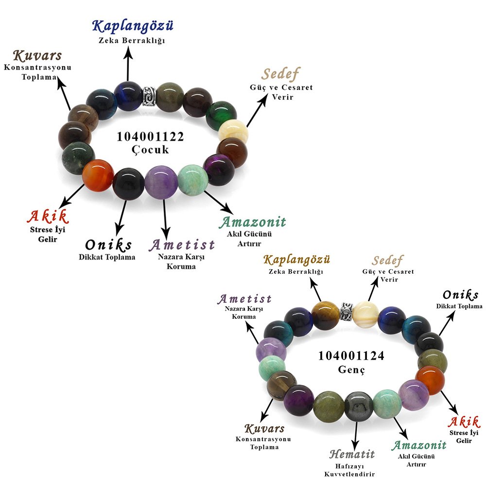 Hergestellt: Naturstein. Verwendete Steine: Achat-Amethyst-Türkis-Quarz-Tigerauge-Onyx-Perlmutt-Amazonit. Farbe: Mischung. Länge: Elastisch. Vorbereitungszeit: 1 Werktag. Produktverpackung. Ihr Produkt wird mit einem versendet Schutzbox mit Ihrem Logo. Spezielle Optionen für Geschenkboxen finden Sie in der Kategorie „Geschenkbox“ im Menü. Beschreibung des Natursteins: Achat: Er verleiht den unter Spannung stehenden Körperbereichen ein Gefühl von Wärme und reduziert Spannungen. Es gibt Energie. Es gibt der Person, die es trägt, Kraft und Freude. Es erhöht die körperliche Vitalität und beseitigt Faulheit. Als Ring verwendet, steigert er das Selbstbewusstsein. Da es lebendig und energisch ist, hilft es Ihnen, die positiven Aspekte von Ereignissen zu erkennen, wenn Sie sich schlecht fühlen. Es schützt Kinder, die den Achatstein in ihren Taschen tragen, vor negativen Emotionen. Amethyst: Er wird seit Jahrhunderten in vielen Zivilisationen mit Bewunderung verwendet. Es ist auch der stärkste Stein in Bezug auf die Heilung. Da es eine negative elektrische Ladung trägt, erhöht es die Gehirnleistung, indem es überschüssige Elektrizität im Körper sammelt. Es reicht aus, irgendwo in Ihrer Umgebung zu stehen, um negative Energien zu zerstören und in positive Energie umzuwandeln. Es ist gut gegen Schlaflosigkeit. Da es sich um einen Stein handelt, den Sie immer bei sich tragen können, versorgt er Sie stets mit Nutzen und Energie. Es gibt Energie. Tigerauge: Es wird auch als Stein der Unabhängigkeit bezeichnet. Der Grund dafür ist, dass angenommen wird, dass der Stein die Menschen, die ihn tragen, unabhängiger von anderen Menschen macht. Es ist nützlich für Kinder, die Albträume haben. Es ermöglicht einem, die gute Seite der Menschen zu sehen. Es ist ein Stein der Stärke und des Mutes. Sie können Ihre Beschwerden lindern, indem Sie die glatte Oberfläche streicheln. Es reduziert Sturheit, ermöglicht eine klarere Sicht und schützt vor dem bösen Blick. Es erinnert Menschen an den eigenen Zweck, die denken, dass ihr Leben keinen Sinn hat. Es kann Ihnen auch ermöglichen, eine telepathische Kommunikation mit den Menschen herzustellen, mit denen Sie in Kontakt stehen. Onyx: Er gehört zur schwarzen Farbgruppe unter den Heilsteinen. Es ist sehr effektiv bei positivem Denken. Es sorgt für Konzentration. Es gleicht die Beziehungen zwischen Mann und Frau aus und stärkt sie. Es ist wirksam gegen schlimme Ängste. Es beseitigt auch die Angst vor der Zukunft. Es hilft der Person, Süchte loszuwerden. Es wird gegen den bösen Blick eingesetzt. Es unterstützt den Menschen mit seiner Energie. Er wird auch als Stein des Glücks bezeichnet. Es schützt Menschen vor übermäßig intensiven Emotionen und verringert das Risiko, Fehler zu machen. Perlmutt: Perlmutt ist organischen Ursprungs. Perlmutt, auch Stein der Stärke und des Mutes genannt, reinigt den Körper von Giftstoffen. Es ermöglicht Ihnen, bewusst und entschlossen zu sein und sich gegen negative Urteile stark zu machen. Er bewahrt die Entschlossenheit angesichts von Kritik und Widersprüchen. Türkis: Es ist der Stein der Loyalität, Freundschaft und Kommunikation. Es ist auch ein äußerst wichtiger Stein für die Gesundheit der Knochen. Es lindert Husten und verbessert die geistige und logische Leistungsfähigkeit. Dieser Stein beruhigt Ängste; Es reguliert den Blutdruck und ist gut bei Herzerkrankungen. Amazonit: Es steigert die Selbstausdruckskraft des Menschen. Der Amazonitstein, der mit dem Herzen, den Muskeln und dem Nervensystem in Verbindung steht, verleiht dem Leben eines Menschen einen Sinn und erleichtert die Akzeptanz von Veränderungen. Es steigert die geistige Leistungsfähigkeit und stärkt das Verständnis und die Auffassungsgabe. Quarz: Quarz, der bereits seit Jahrhunderten im Bereich der Behandlung eingesetzt wird, wird auch heute noch in diesem Bereich eingesetzt. Es ist ein Stein, der die geistige Konzentration stärkt. Es sammelt Strahlung von Radios, Computern und Mobiltelefonen. Es stimuliert die Gehirnfunktionen. Es zerstört die negative Energie um die Person herum und lädt positive Energie auf. Wenn es auf die Haut aufgetragen und unter der Kleidung getragen wird, schützt es die Person vor den negativen Energien anderer Menschen. Es ist gesund für die Augen. Außerdem hält es das Verdauungs- und Blutkreislaufsystem fit.
