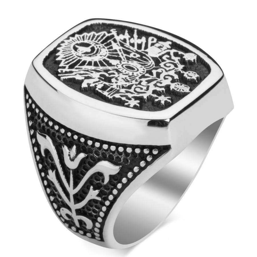 Merkmale des Herrenrings aus 925er-Sterlingsilber mit aufgesticktem osmanischen Staatswappen. Hergestellt aus 925er-Sterlingsilber. Es wiegt etwa 14 Gramm. Der Ring ist an den Seiten mit einem gemusterten Design versehen.
