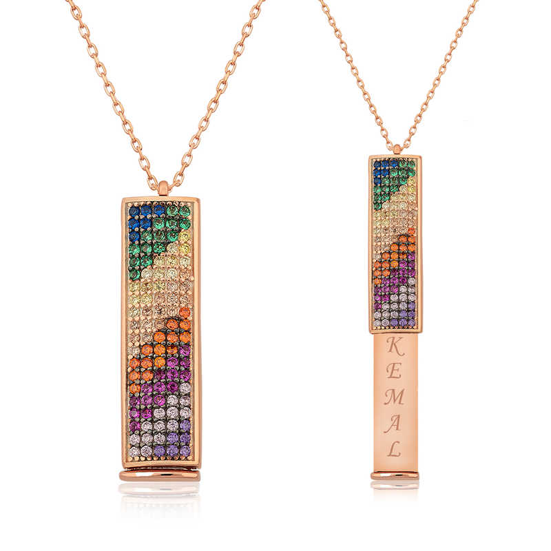 Personalisierte Regenbogen-Halskette mit silberner Rose. Die Halskette, mit der Sie jederzeit Ihre Liebe zu Ihrem Liebhaber und Ihr erstes Glücksmoment in Erinnerung rufen können und die Sie mit Ihrem Namen gravieren können, um Ihre romantischsten Momente zu begleiten, wurde speziell für Liebhaber entwickelt. Eine personalisierte Halskette mit bunten Steinen und einem darin eingravierten Namen ist eines der bedeutungsvollsten Geschenke, die Sie Ihrem Liebsten machen können, mit dem Sie eine lange Beziehung erwarten. Diese speziell entworfene Halskette besteht aus 925er Sterlingsilber. Rose auf Silber plattiert. Damenhalskettenmodelle aus roséplattiertem Silber behalten lange ihren Glanz, verwandeln das Silber in eine rosa Farbe und verzögern die Oxidation. Die Steine an der Halskette sind aus Zirkon. Die durchschnittliche Kettenlänge beträgt 45 cm. Aufgrund von Silber und Edelsteinen kann es zu einer Abweichung des Produktgewichts von ± 10 % kommen. Hinweis: Personalisierte Produkte sind vom Umtausch ausgeschlossen. Breite: 0,70 cm Länge: 2,70 cm Durchschn. Gewicht: 4,32 Gr