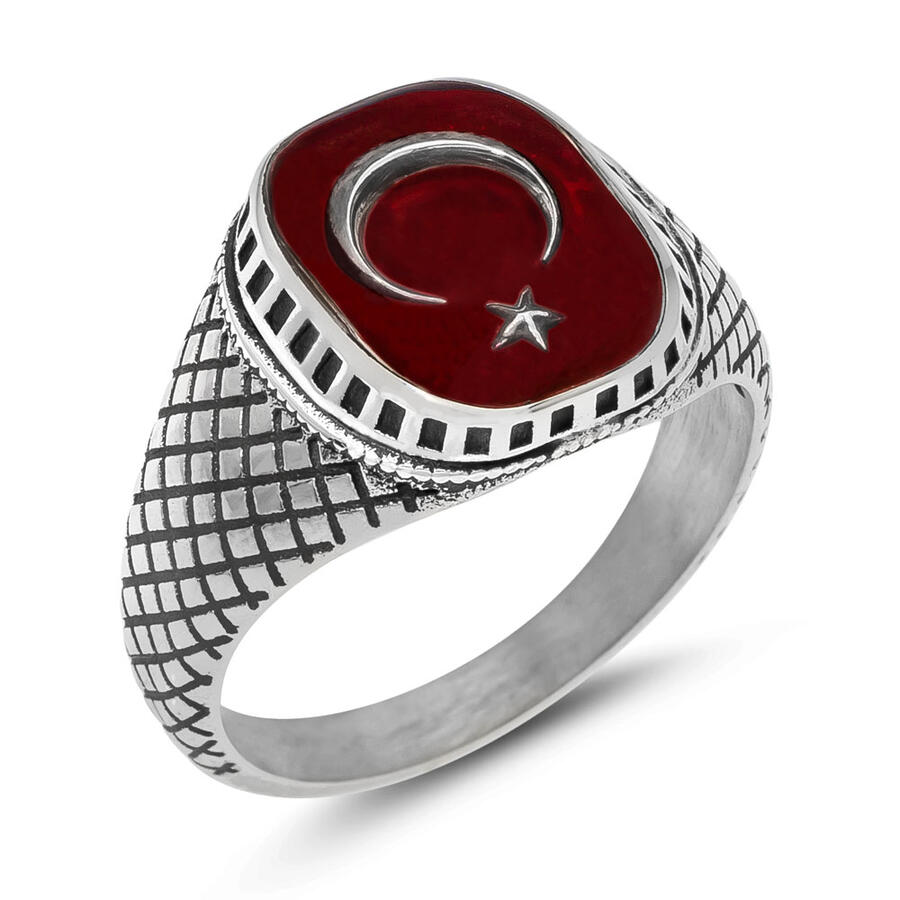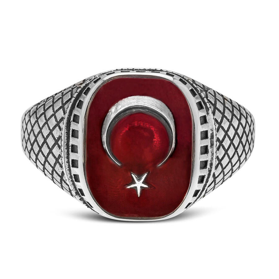 Ring der Organization-Serie (Halbmond und Stern aus 925er-Sterlingsilber für Damen) Produktmerkmale: Hergestellt aus 925er-Sterlingsilber. Es handelt sich um einen Ring mit türkischer Flagge und einem Halbmond- und Sternmotiv auf roter Emaille. Sie können die Lebensdauer Ihres Silberaccessoires verlängern, indem Sie auf Seife, Deodorant, Schweiß und Wasser verzichten. Ihre Ringgröße können Sie kostenlos beim Juwelier erfahren.