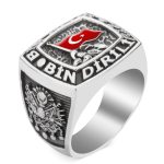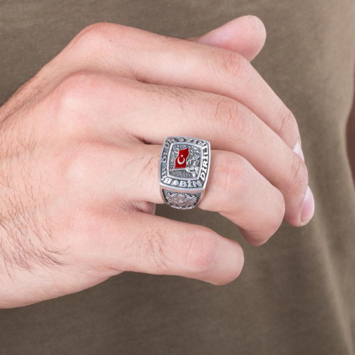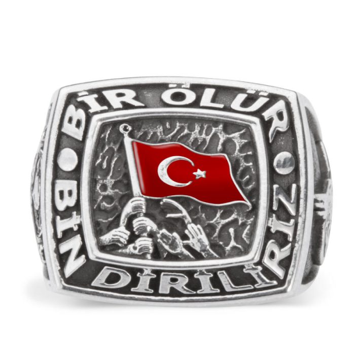 Merkmale des We Die and Rise Again-Rings mit Motiv der türkischen Nation. Er besteht aus 925er Sterlingsilber. Es wiegt etwa 17 ± Gramm. Auf dem Ring sind die Worte „We Die Once, We Resurrect Thousands“ eingerahmt. Auf dem Ring befindet sich ein Motiv der türkischen Nation, das die türkische Flagge trägt. Schauen Sie sich diesen Halbmond- und Sternring genauer an, der von der ewigen Hingabe der türkischen Nation an die türkische Flagge und der Bedeutung der türkischen Flagge inspiriert ist! Dieser Silberring, der das türkische Volk darstellt, das das Heimatland und die Republik beschützt, ist in einer eckigen Form gestaltet. Während sich auf dem Ring eine Figur der türkischen Nation befindet, die die türkische Flagge trägt, ist sie mit dem Text „Einer stirbt, tausend stehen wieder auf“ umrahmt. Der Ring, der die Botschaft „Einer stirbt, tausend erstehen“ widerspiegelt, die zum Ausdruck bringt, dass wir gegen den Feind wachsen und stärker werden, trägt auf der einen Seite das osmanische Monogramm und auf der anderen Seite das osmanische Wappenmotiv. Dieser Ring aus 925 Karat Silber stellt die türkische Nation dar, die unser rotes Banner beschützt und am Leben erhält. Dieser Ring ist mit seinem stilvollen Aussehen und Design, das zu der Bedeutung passt, die er trägt, zu einem besonderen Accessoire geworden. Sie können es für sich selbst oder für Ihre Lieben kaufen und haben ein Accessoire, auf das Sie ein Leben lang nie verzichten werden.