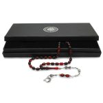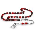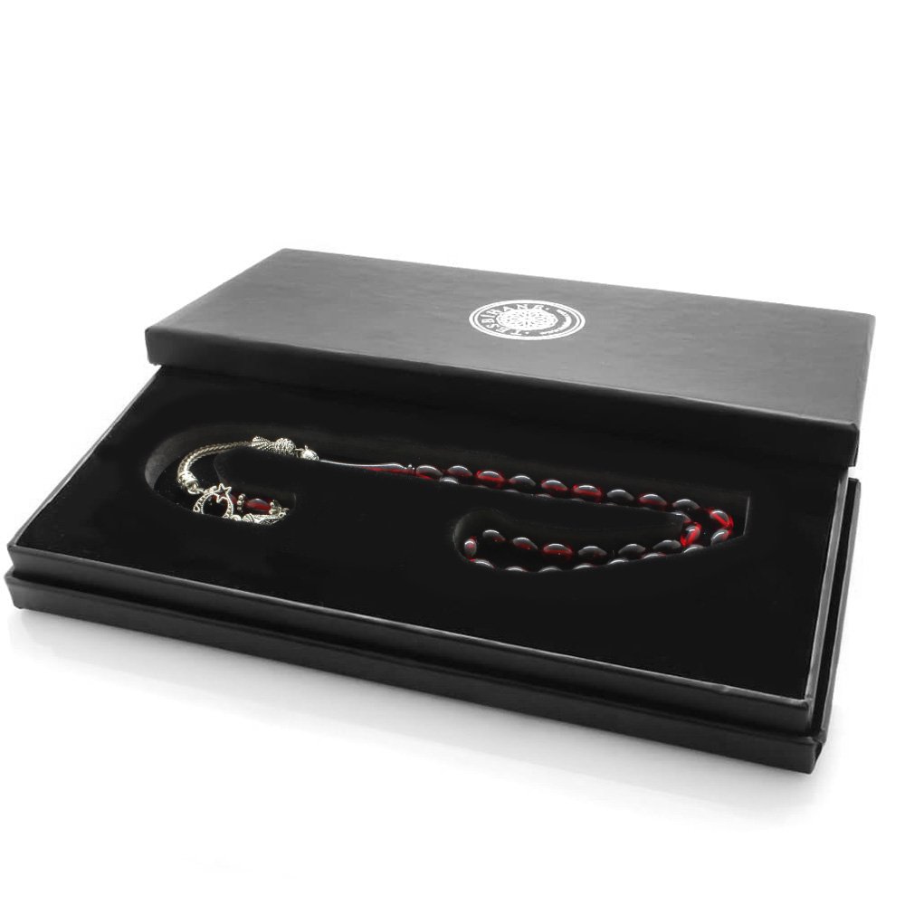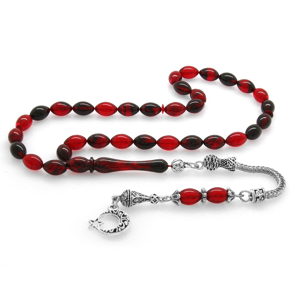 Home TESBİH Gebetsperlen aus Bernstein Preiswerte Gebetsperlen aus Bernstein Rot-schwarzer Feuerbernstein-Rosenkranz im Halbmond- und Sternschliff mit anlaufgeschützten Metallquasten
