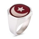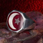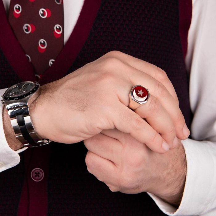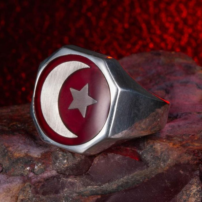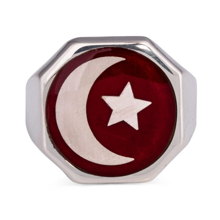 Herrenring aus 925er-Sterlingsilber mit rotem Emaille-Halbmond und Stern-Diagonal-Malcolm-X-Ring. Produktmerkmale: Hergestellt aus 925er-Sterlingsilber. Gewicht ca.: 13-14g. Es kann je nach Ringgröße variieren. Sie können die Lebensdauer Ihres Silberaccessoires verlängern, indem Sie auf Seife, Deodorant, Schweiß und Wasser verzichten. Ihre Ringgröße können Sie kostenlos beim Juwelier erfahren.