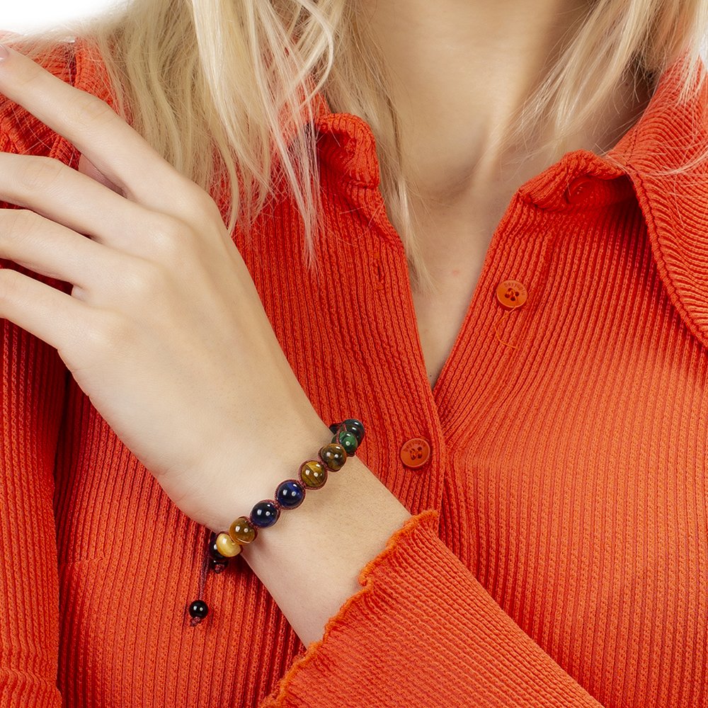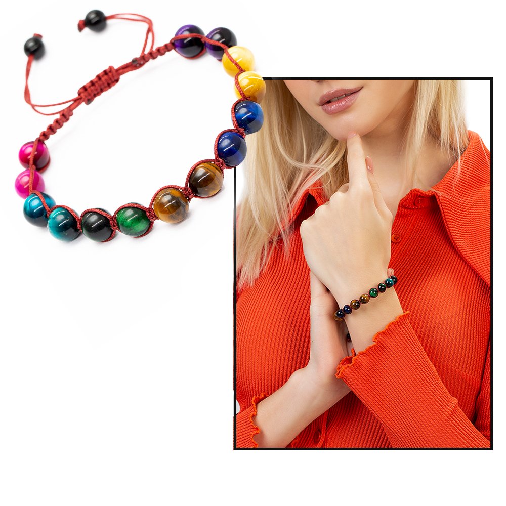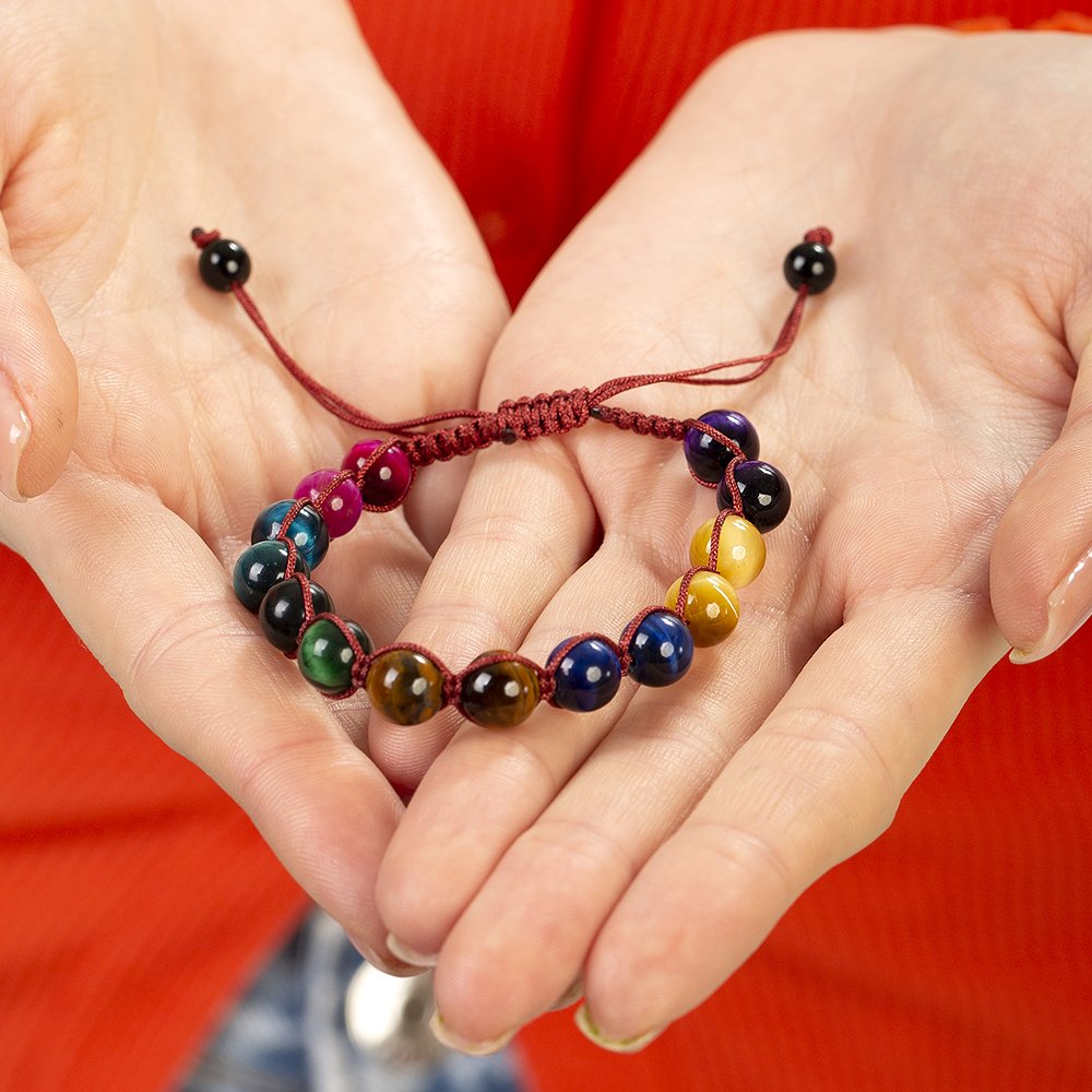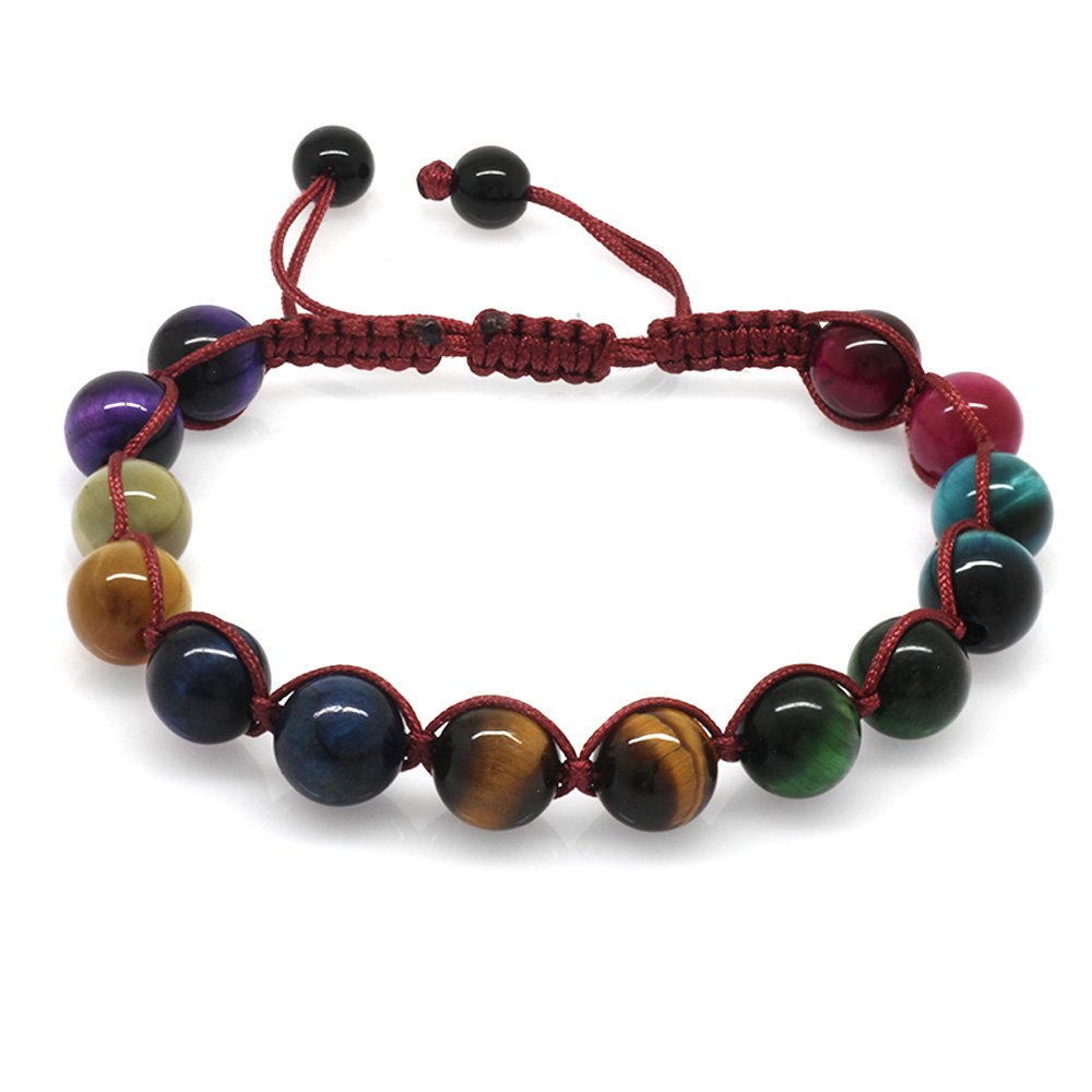 Rotes geflochtenes Makramee-Energiearmband für Damen im Kugelschliff mit mehreren Tigerauge-Natursteinkombinationen