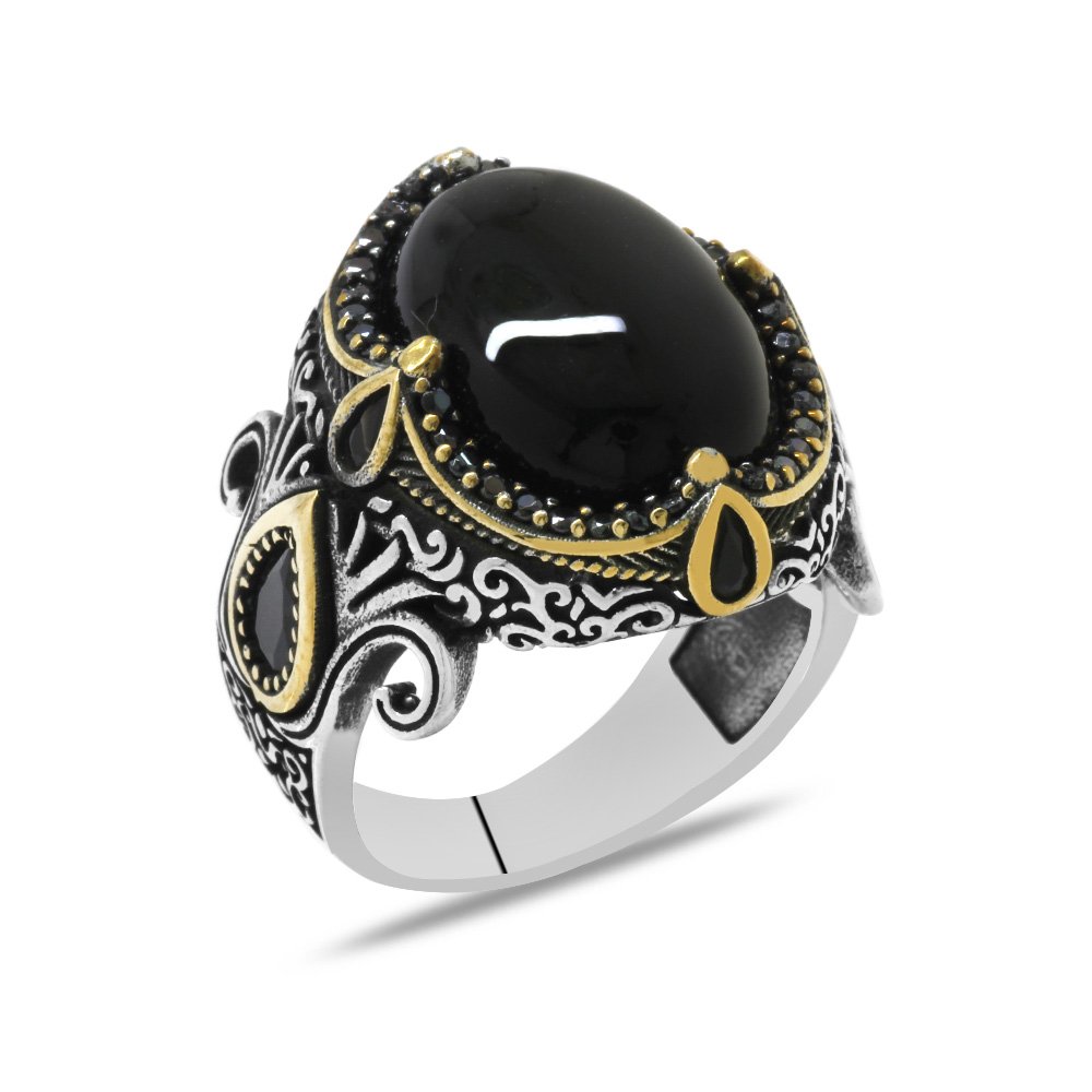 Schwarzer Zirkonstein verzierter Ethno-Design-Onyxstein-Herrenring aus 925er-Sterlingsilber