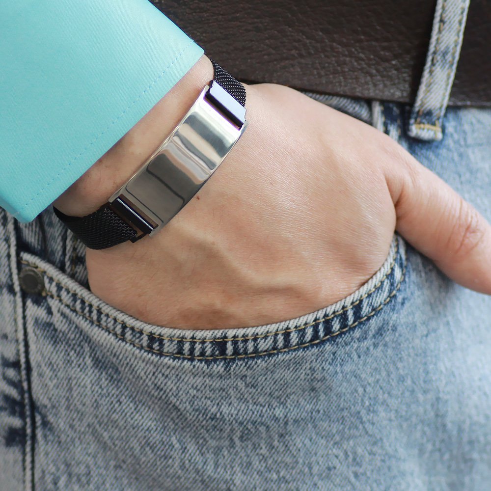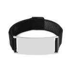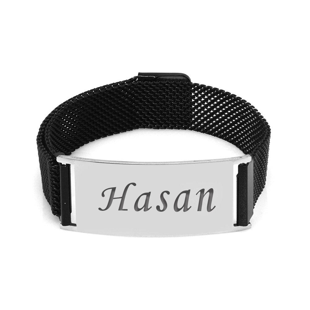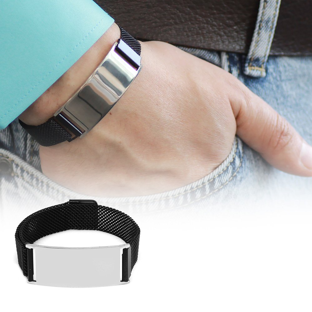Schwarzes Herren-Mesh-Armband aus Stahl mit personalisiertem Magnetverschluss mit Namensaufschrift