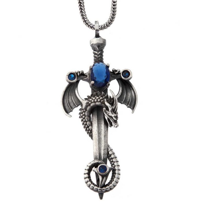 Silberne Drachen-Herrenschwert-Halskette mit Saphirstein. Das Drachenschwert ist ein japanisches Symbol, das oft mit der japanischen Kultur und Geschichte in Verbindung gebracht wird. Das Drachenschwert hat eine lange und komplexe Geschichte. Die erste Erwähnung erfolgte in einem Buch namens „Kojiki“ aus der frühen Edo-Zeit (1603-1868). In dieser Geschichte findet der Gott Susanoo zwei Schwerter, eines namens „Totsuka“ und das andere „Amakuni“. Er bringt sie zu seinem Bruder Izanagi, der sie als Symbole der Macht akzeptiert. Diese Schwerter werden Izanagis Sohn Amaterasu gegeben. Das Drachenschwert wurde auch von Samurai-Kriegern im feudalen Japan als Hauptwaffe verwendet. Sie glaubten, dass sie mit diesen Schwertern jeden Feind besiegen könnten, dem sie auf dem Schlachtfeld begegneten. Auch in der chinesischen Kultur ist das Drachenschwert ein wichtiges Symbol. Es ist ein Symbol für Stärke, Macht und Glück; Nahe an der japanischen Bedeutung. Das Drachenschwert ist seit Jahrhunderten Teil ostasiatischer Kulturen. Es heißt, dass das Drachenschwert dem Gelben Kaiser von einem mysteriösen alten Mann aus dem östlichen Meer geschenkt wurde. Das Drachenschwert wurde von Generation zu Generation weitergegeben, um von Kaisern und Helden in Zeiten der Not eingesetzt zu werden. Das Drachenschwert gilt seit der Han-Dynastie als Kunstobjekt. Es war oft mit Gold oder Silber verziert und hatte aufwendige Muster auf der Klinge. Das Drachenschwert wurde auch bei Zeremonien verwendet, bei denen es von einem hochrangigen Beamten oder General getragen wurde, um seine Macht und sein Ansehen zu symbolisieren. Dieses speziell entworfene Drachen-Herrenschwert-Halskettenmodell mit silbernem Saphirstein besteht aus 925er Sterlingsilber. Auf Silber erfolgt eine Oxidbeschichtung. Herrenhalskettenmodelle aus oxidiertem Silber wirken abgenutzt. Die Kettenlänge der Halskette beträgt ca. 55 cm und ist aus Silber gefertigt. Wie alle Herrenkettenmodelle wird auch das Herrenkettenmodell Silberschwert in Handarbeit gefertigt. Aufgrund von Silber und Edelsteinen kann es zu einer Abweichung von ± 10 % im angegebenen durchschnittlichen Produktgewicht kommen. Breite: 2,40 cm Höhe: 5,50 cm Gewicht: 15,50 gr. Abdeckung. Kettenlänge: 55,00 cm