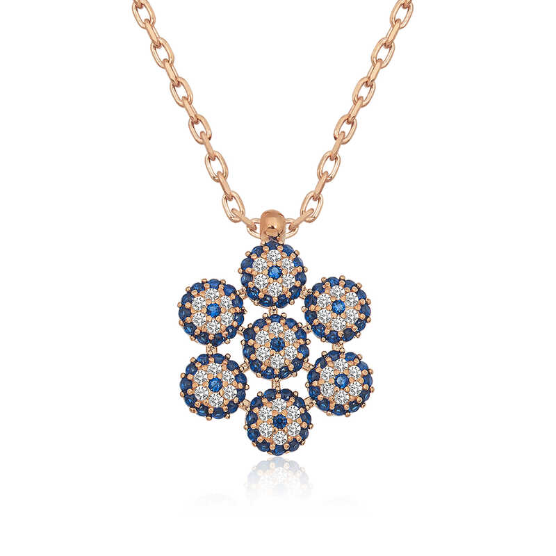 Silberne Rose-Blumen-Modell-Halskette mit bösem Blick. In vielen Kulturen wurden verschiedene Talismane zum Schutz vor Schäden durch schlechte Energie verwendet. Der in den meisten östlichen Kulturen verwendete Talisman ist das Auge. Auch die Evil-Eye-Perlen sind von der Form des Auges inspiriert. Es ist kein Zufall, dass die Farbe Blau gewählt wurde. Evil-Eye-Perlen werden meist in Blau gestaltet, weil man glaubt, dass sie die Energie von Menschen mit farbigen Augen besser widerspiegeln. Sie können die Blumen-Halskette mit bösem Blick Ihren Lieben und Menschen schenken, die von ihrer Schönheit beeindrucken und vor dem bösen Blick geschützt werden möchten. Die Kette der Damenhalskette mit Zirkonstein Evil Eye besteht aus 925er Sterlingsilber. Rose auf Silber plattiert. Roséplattierte silberne Evil-Eye-Halskettenmodelle behalten lange ihren Glanz und ihre Oxidation wird verzögert. Dieses Blumenmodell der bösen Blick-Damenhalskette wird wie alle anderen silbernen Damenhalskettenmodelle von Hand gefertigt. Aufgrund von Silber und Edelsteinen kann es zu einer Abweichung von ± 10 % im angegebenen durchschnittlichen Produktgewicht kommen. Breite: 0,80 cm Länge: 0,80 cm Durchschn. Gewicht: 2,70 gr.