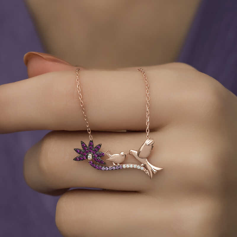 Die Silver Rose Mother And Baby Bird Damenhalskette ist ein besonderes Design, das die Liebe zwischen Mutter und Kind darstellt. Eines der passendsten Geschenke, die Sie kaufen können, um Ihre Hingabe an Ihre Mutter zum Ausdruck zu bringen, ist diese Mutter-Kind-Vogeldamen-Halskette. Diese speziell für Ihre Mutter entworfene Mutter- und Vogelbaby-Damenhalskette besteht aus 925er Sterlingsilber. Rose auf Silber plattiert. Roséplattierte Damen-Halsketten mit Mutter- und Vogelbaby-Motiv aus Silber behalten ihren Glanz lange und die Oxidation wird verzögert. Die Steine ​​an der Halskette sind aus Zirkon. Die durchschnittliche Länge der Silberkette beträgt 45 cm. Die silberne Damenhalskette „Mutter und Vogelbaby“ wird von Hand gefertigt. Aufgrund von Silber und Edelsteinen kann es zu einer Abweichung von ± 10 % im angegebenen durchschnittlichen Produktgewicht kommen. Breite: 3,00 cm Länge: 0,70 cm Durchschn. Gewicht: 2,10 g