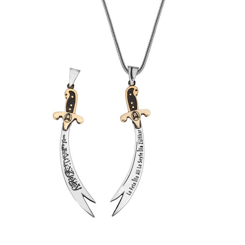 Silberne Zulfikar-Schwerthalskette Hz. Ali zeigte in der Schlacht von Uhud großen Heldenmut. Als er versuchte, den Propheten im Krieg zu beschützen, zerbrach sein Schwert. Als der Prophet dies sah, gab er ihm sein eigenes Schwert, Zulfiqar. Mit der Schärfe des Schwertes spaltete es andere Schwerter in zwei Hälften und schrieb epische Schlachten. Hz. Ali Zülfikar führt jetzt Kriege mit seinem Schwert … Es ist bekannt, dass das Schwert nach dem Tod von Hadhrat Ali in den Himmel gebracht wurde. Einem anderen Gerücht zufolge soll es zwischen den Flüssen Tigris und Euphrat liegen. Die Person, die die islamischen Armeen regieren wird, wird der Besitzer dieses Schwertes und der Oberbefehlshaber der Armeen sein. Diese stilvolle Halskette; Sie können es als Geburtstagsgeschenk, Valentinstagsgeschenk oder Geschenk zu besonderen Anlässen wählen. Die Halskette besteht aus 925er Sterlingsilber. Auf Silber erfolgt eine Oxidbeschichtung. Halskettenmodelle aus oxidiertem Silber haben ein authentisches Aussehen und ihr Anlaufen wird verzögert. Wie alle Halskettenmodelle wird auch das silberne Zulfiqar-Schwerthalskettenmodell vollständig von Hand gefertigt. Aufgrund von Silber und Edelsteinen kann es zu einer Abweichung von ± 10 % im angegebenen durchschnittlichen Produktgewicht kommen. Breite: 0,90 cm. Länge: 7,20 cm. Durchschnittlich. Gewicht: 10,00 gr. Kettenlänge: 55 cm