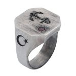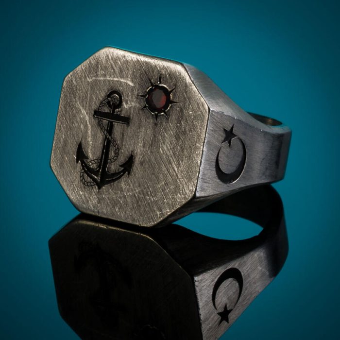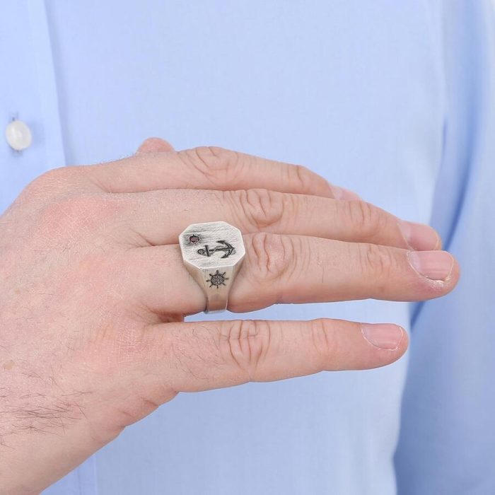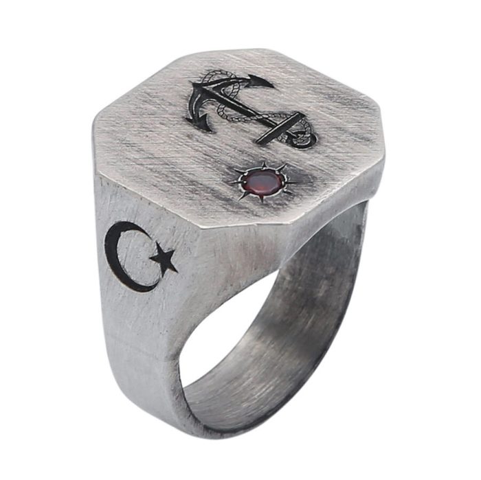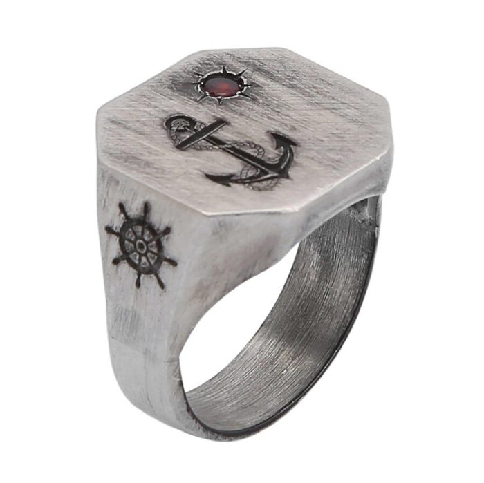 Silberner achteckiger Anker-Ruder- und Halbmond-Stern-Mini-Herrenring mit rotem Zirkonstein. Produktmerkmale: Hergestellt aus 925er Sterlingsilber. Das ungefähre Gewicht beträgt etwa 13 Gramm. Sie kann je nach Ringgröße variieren. Sie können die Lebensdauer Ihres Silberrings verlängern, indem Sie auf Seife, Deodorant, Schweiß und Wasser verzichten. Ihre Ringgröße können Sie kostenlos beim Juwelier erfahren.
