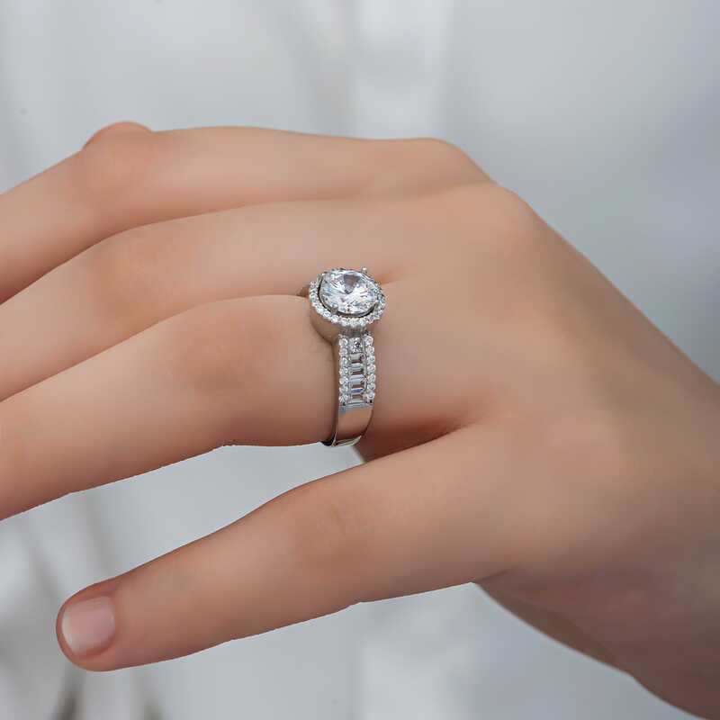 Silberner Einzelstein-Damenring Dieser speziell entworfene Einzelsteinring besteht aus 925er Sterlingsilber. Es ist auf Silber rhodiniert. Rhodinierte Damenringmodelle aus Silber behalten lange ihren Glanz und ihre Oxidation wird verzögert. Die Steine am Ring sind Zirkon und Baguette. Es ist eine perfekte Geschenkoption, die Sie Ihren Liebsten zum Geburtstag, zum Valentinstag und zu besonderen Anlässen schenken können. Wie alle unsere Damenring-Modelle aus Silber wird auch dieser Solitär-Damenring komplett von Hand gefertigt. Aufgrund von Silber und Edelsteinen kann es zu einer Abweichung von ± 10 % im angegebenen durchschnittlichen Produktgewicht kommen. Breite: 2,10 cm Länge: 2,60 cm Durchschn. Gewicht: 4,20 gr.
