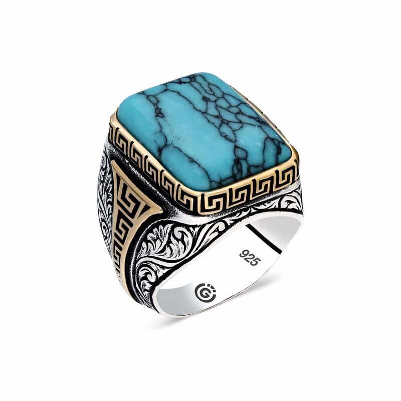Quadratischer Herrenring mit silbergestreiftem türkisfarbenem Stein. Dieses Herrenringmodell, bestehend aus türkisfarbenem Stein auf Silber, ist ein stilvolles Accessoire, das Sie zu jeder Tageszeit tragen können. Dieser Ring; Sie können es sich selbst oder Ihren Lieben zum Geburtstag, Vatertag oder zu besonderen Anlässen schenken. Das Herrenringmodell mit gestreiftem Türkisstein besteht aus 925er Sterlingsilber. Auf Silber erfolgt eine Oxidbeschichtung. Silberne Herrenringmodelle mit Oxidbeschichtung behalten lange ihren Glanz. Wie alle Herrenringe wird auch das Herrenringmodell mit silbernem, gestreiftem Türkisstein in Handarbeit hergestellt. Aufgrund von Silber und Edelsteinen kann es zu einer Abweichung von ± 10 % beim angegebenen durchschnittlichen Produktgewicht kommen. Durchschnittlich. Gewicht: 17,00 gr.