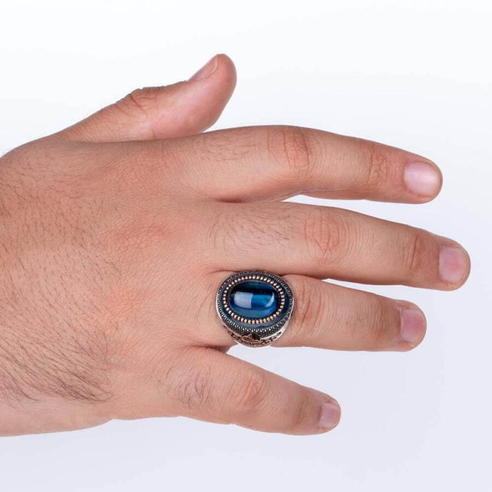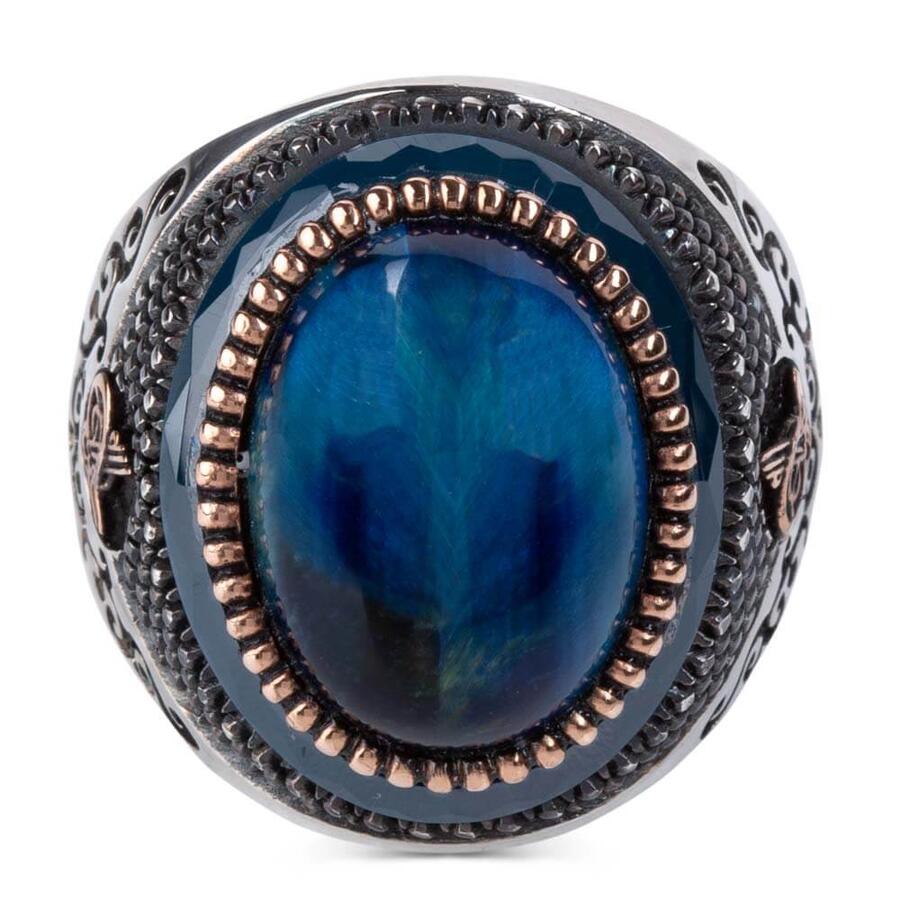 Silberner Herrenring mit blauem Tigerauge-Stein und Monogramm an den Seiten. Produktmerkmale: Hergestellt aus 925er Sterlingsilber. Gewicht ca.: 12–13 g. Es kann je nach Ringgröße variieren. Es kann zu Unterschieden in den Mustern/Tönen auf dem Stein kommen. Auf den Seiten des Rings befindet sich ein osmanisches Monogramm. Sie können die Lebensdauer Ihres Silberrings verlängern, indem Sie auf Seife, Deodorant und Schweiß verzichten und Wasser. Ihre Ringgröße erfahren Sie kostenlos beim Juwelier.