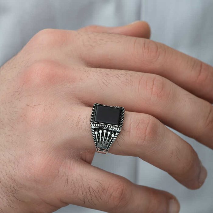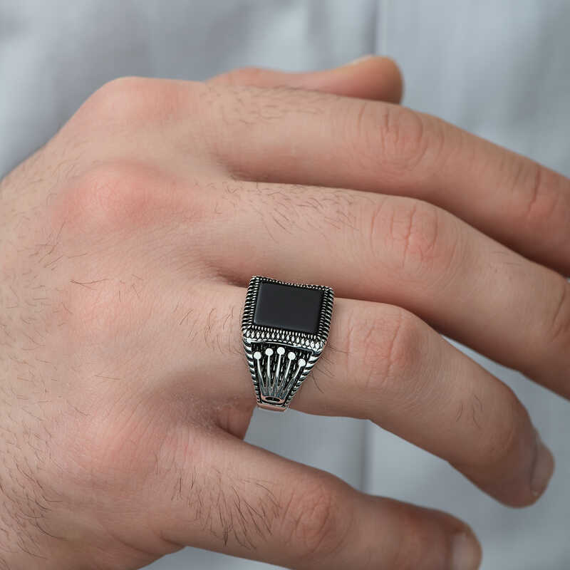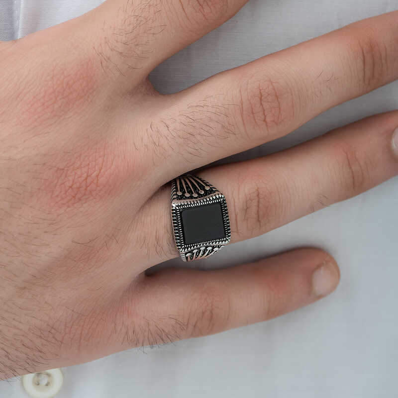 Silberner Onyx-Stein-Kronenmuster-Herrenring Der Onyx-Stein, der über Millionen von Jahren auf die Erde gelangte, ist ein Stein, der durch Erhitzen und Abkühlen von Gesteinen und einigen Bestandteilen im Laufe der Zeit entsteht. Der Onyxstein ist als Glücksstein bekannt und gehört zu den Halbedelsteinen. Onyx wurde von der Antike bis zur Gegenwart bei der Herstellung verschiedener Ornamente und Schmuckstücke verwendet, da er bearbeitbar und ästhetisch elegant ist. Der Onyxstein ist der heilige Stein der Erdzeichen Stier, Jungfrau und Steinbock. Menschen mit diesem Sternzeichen können sich vor negativer Energie schützen, indem sie sich für Accessoires aus Onyxstein entscheiden. Das fingerförmige Kronenzeichen an den Seiten des Rings symbolisiert die geschickten Finger des Meisters. Andererseits wird es mit seinem Bild der Königskrone als Symbol für Macht, Macht oder Adel beschrieben. Dieser stilvolle Ring; Sie können es sich selbst oder Ihren Lieben zum Geburtstag, zum Vatertag und zu anderen besonderen Anlässen schenken. Dieser stilvolle Ring besteht aus 925er Sterlingsilber. Auf Silber erfolgt eine Oxidbeschichtung. Mit Oxid beschichtete Ringe haben ein authentisches Aussehen. Wie alle Herrenringe wird auch das Herrenringmodell mit silbernem Onyx-Steingeflechtmuster in Handarbeit hergestellt. Aufgrund von Silber und Edelsteinen kann es zu einer Abweichung von ± 10 % im angegebenen durchschnittlichen Produktgewicht kommen. Breite: 1,50 cm. Höhe: 1,50 cm. Abdeckung. Gewicht: 8,10 gr.