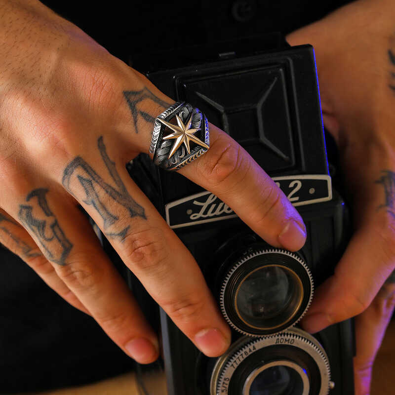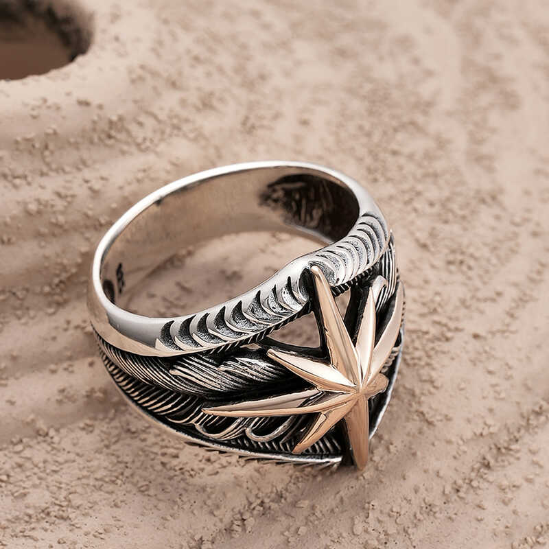 Silberner Herrenring mit Polarstern-Motiv. Der Polarstern zeigt ständig nach Norden, weil er sich nicht bewegt. Der Polarstern hat etwas mit der Seefahrt zu tun. In der Antike fanden Seefahrer ihren Weg, indem sie die Sterne am Himmel betrachteten. Da sie bei der Rückkehr nach Hause auf die Sterne angewiesen sind, bedeutet das Tragen dieses Symbols, dass sie sicher nach Hause zurückkehren. Aus dem gleichen Grund tragen auch Soldaten diesen Stern. Der Polarstern ist das Symbol für den sicheren Weg. Eine andere Bedeutung ist, dass ein Mensch seinen eigenen Weg wählen sollte, aber bei diesem Stern Zuflucht suchen kann, wenn er Angst hat oder verloren ist. Sie können Ihren Lieben eine Freude machen, indem Sie der Person, die Ihnen am Herzen liegt, einen bedeutungsvollen Silberring mit Polarstern-Motiv schenken, der ihr sagt, dass sich ihr Platz in Ihnen nie ändern wird und dass Sie mit ihr die richtige Richtung gefunden haben. Dieser Ring besteht aus 925er Sterlingsilber. Auf Silber erfolgt eine Oxidbeschichtung. Silberringmodelle mit Oxidbeschichtung behalten lange ihren Glanz und ihre Oxidation wird verzögert. Wie alle Silberringe wird auch das silberne Herrenringmodell mit Polarstern-Motiv vollständig von Hand gefertigt. Aufgrund von Silber und Edelsteinen kann es zu einer Abweichung von ± 10 % im angegebenen durchschnittlichen Produktgewicht kommen. Ringbreite: 2,30 cm Ringlänge: 2,60 cm Durchschnittsgewicht: 12 g