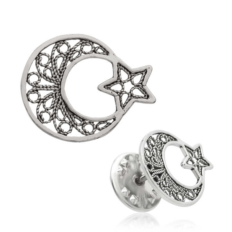 Silbernes filigranes Halbmond- und Sternabzeichen. Wir wissen, dass die türkische Flagge vom Mond und Stern inspiriert wurde, die sich im Blutbad widerspiegelten. Wir bieten Ihnen die einmalige Gelegenheit, die heilige Bedeutung der Flagge an Ihrem Kragen und auf allem zu tragen und sie mit Ihren Lieben zu teilen. Es ist eine perfekte Option für Geburtstagsgeschenke, den Vatertag oder besondere Anlässe. Dieses stilvolle Abzeichen; Es besteht aus 925er Sterlingsilber. Auf Silber erfolgt eine Oxidbeschichtung. Wie alle Silberabzeichen wird auch das silberne filigrane Halbmond-Stern-Abzeichen vollständig von Hand gefertigt. Aufgrund von Silber und Edelsteinen kann es zu einer Abweichung von ± 10 % im angegebenen durchschnittlichen Produktgewicht kommen. Breite: 2,00 cm Länge: 1,50 cm Durchschn. Gewicht: 1,50 gr.